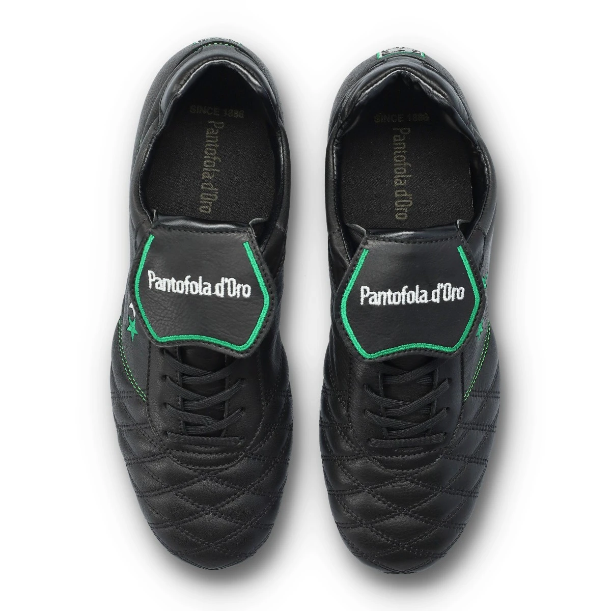 Chaussure de football Pantofola d’Oro Emidio FG. Chaussure en cuir parfaite pour les terrains fermes en gazon naturel. Chaussure haut de gamme en couleur black.