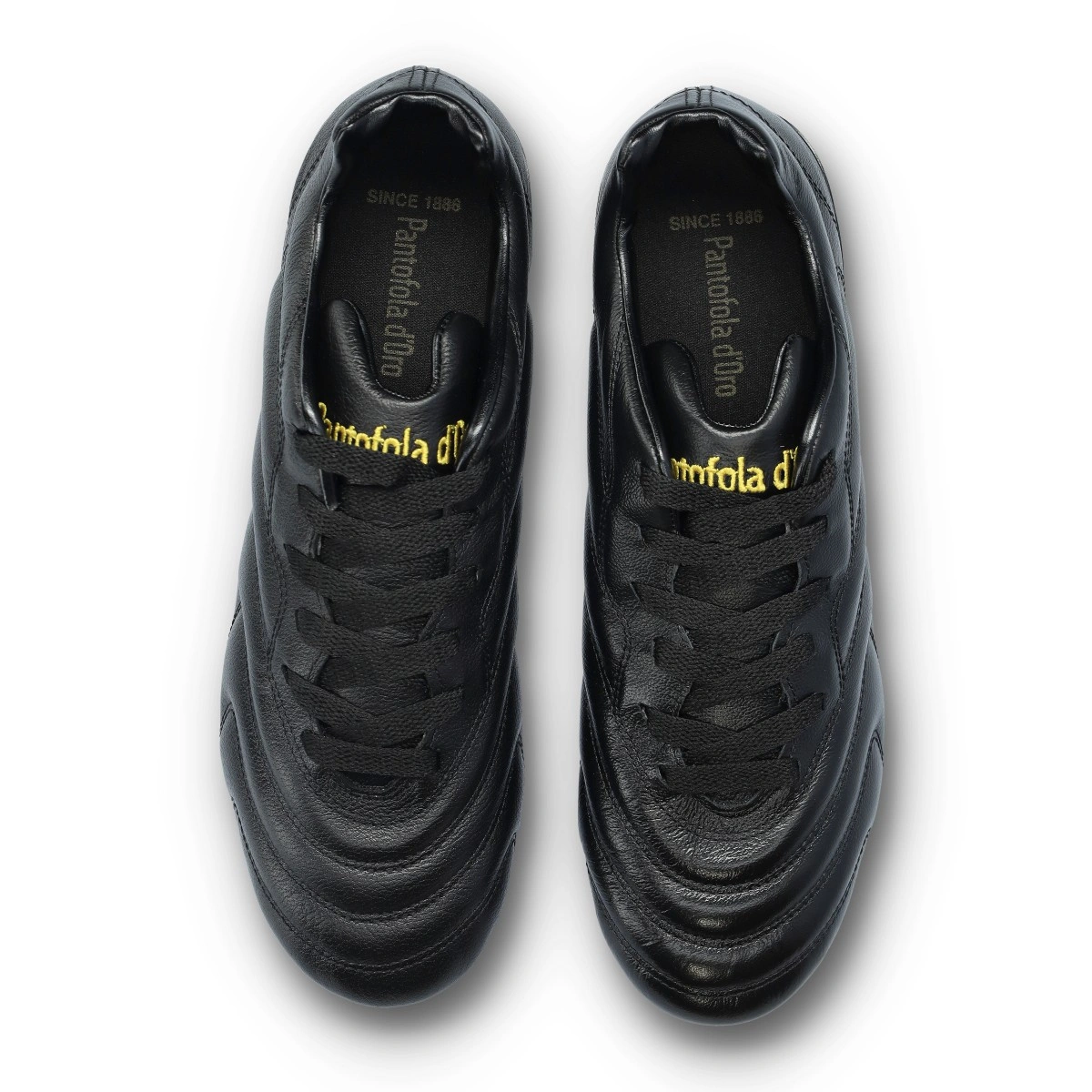 Chaussure de football Pantofola d'Oro Superleggera 2.0 FG. Chaussure en cuir parfaite pour terrains naturels fermes. Chaussure haut de gamme en couleur noire.