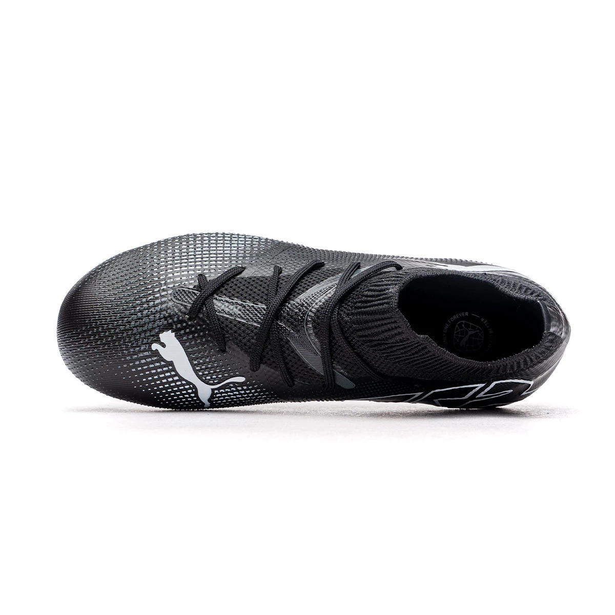 Chaussures de football Puma Future 7 Match FG/AG pour enfants. Chaussures synthétiques à utiliser sur les terrains en gazon artificiel et en gazon naturel. Chaussures bas de gamme en Black-White.