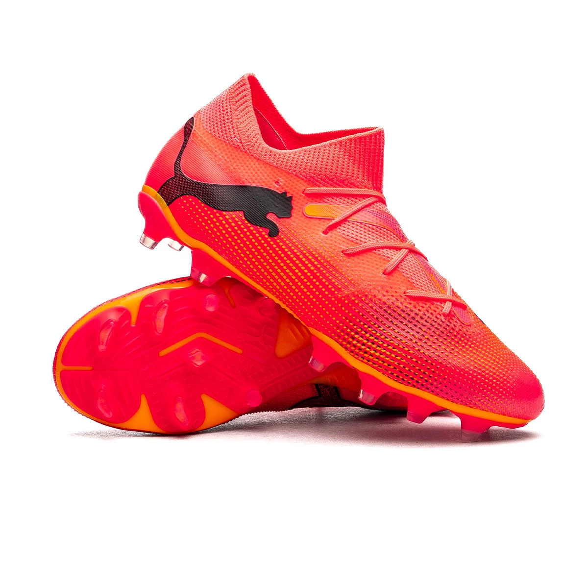 Chaussures de football Puma Future 7 Match FG/AG. Chaussures synthétiques à utiliser sur les terrains en gazon artificiel et en gazon naturel. Chaussures de la gamme de base en couleur Sunset Glow-Black-Sun Stream.