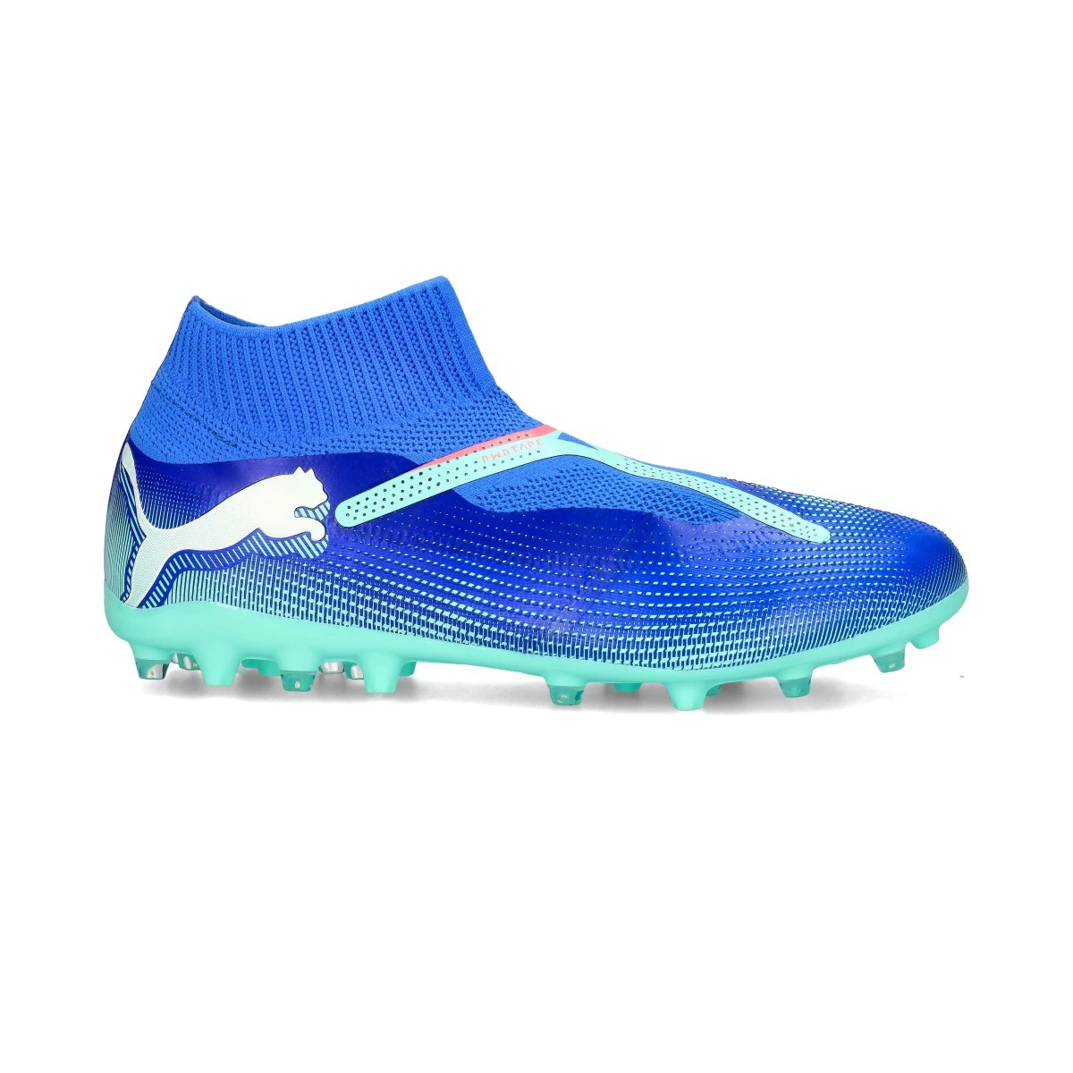 Chaussures de football Puma Future 7 Match + LL MG. Chaussures de football synthétiques, pour terrains en gazon artificiel. Pour les joueurs offensifs, en Bluemazing-White-Electric Peppermint