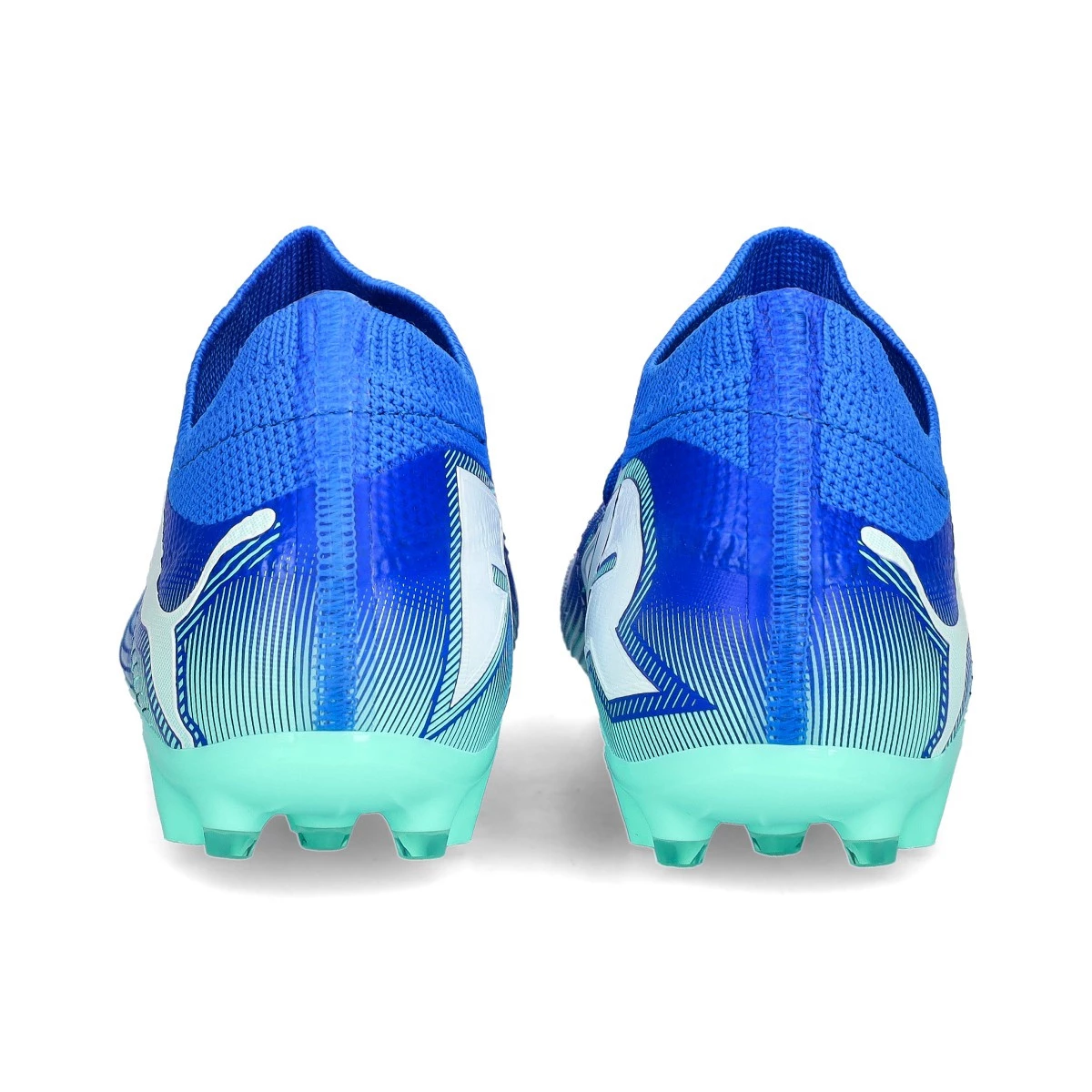 Chaussures de football Puma Future 7 Match MG pour enfant. Chaussures de football synthétiques, pour terrains en gazon artificiel. Pour les joueurs offensifs, coloris Bluemazing-White-Electric Peppermint.