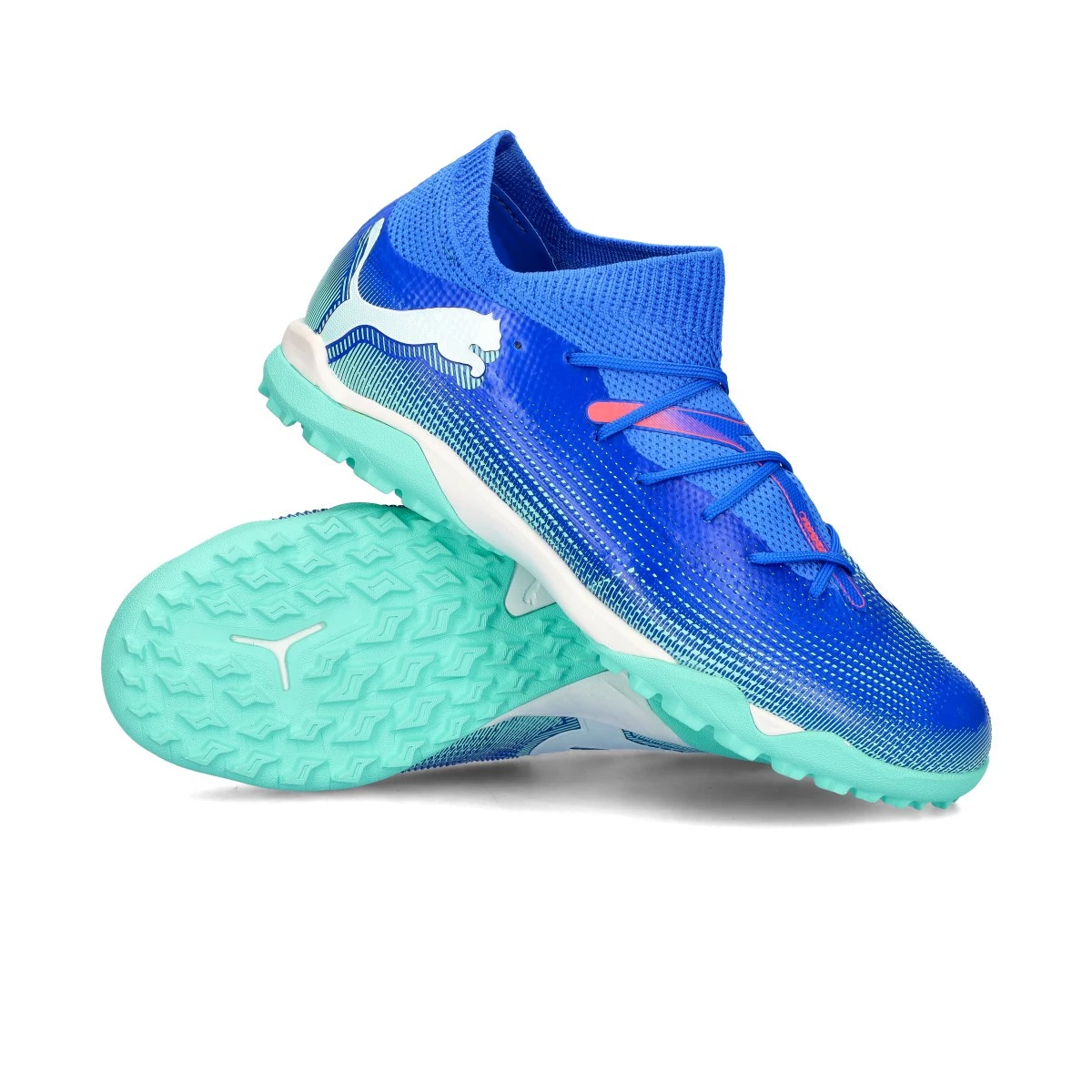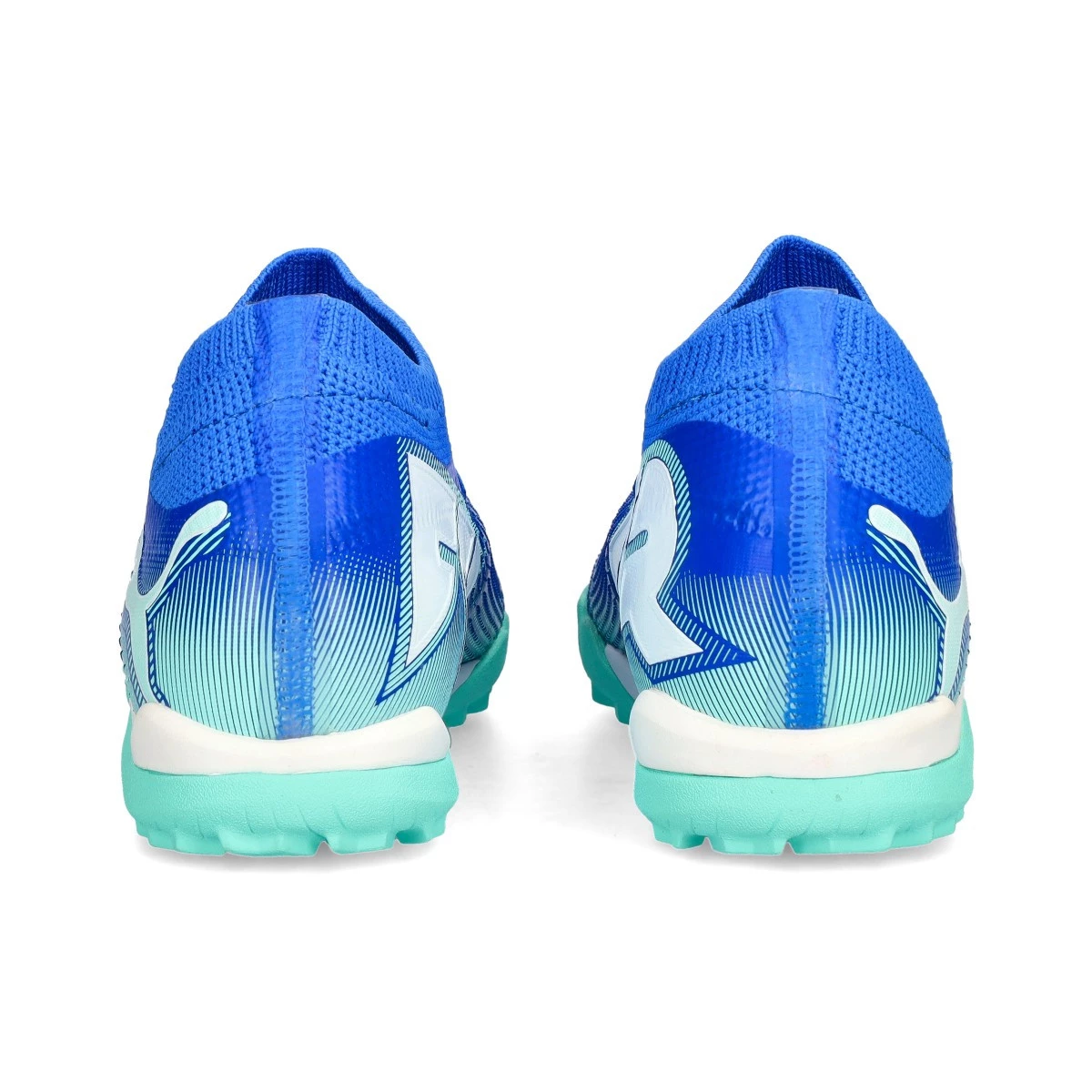 Chaussures de football Puma Future Match Turf + Mid Enfant. Chaussures synthétiques à utiliser sur les terrains en gazon artificiel et en moquette. Chaussures de milieu de gamme en coloris Bluemazing-White-Electric Peppermint.