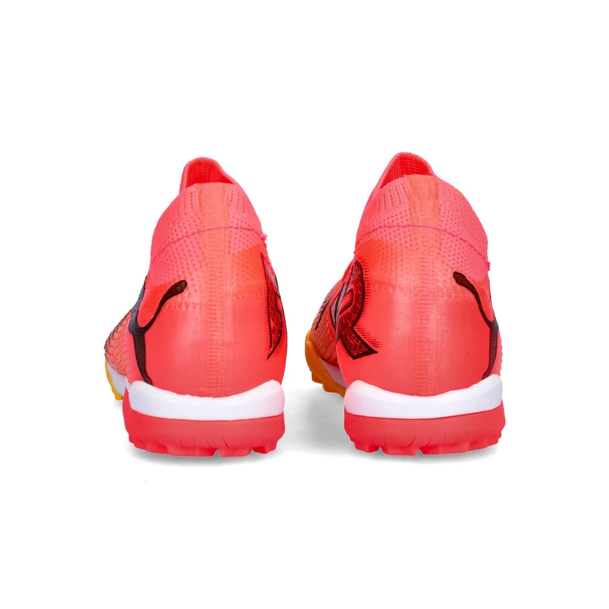 Chaussures de football Puma Future 7 Match Turf + Mid pour enfants. Chaussures synthétiques à utiliser sur les terrains en gazon artificiel et en moquette. Chaussures de la gamme de base en couleur Sunset Glow-Black-Sun Stream.