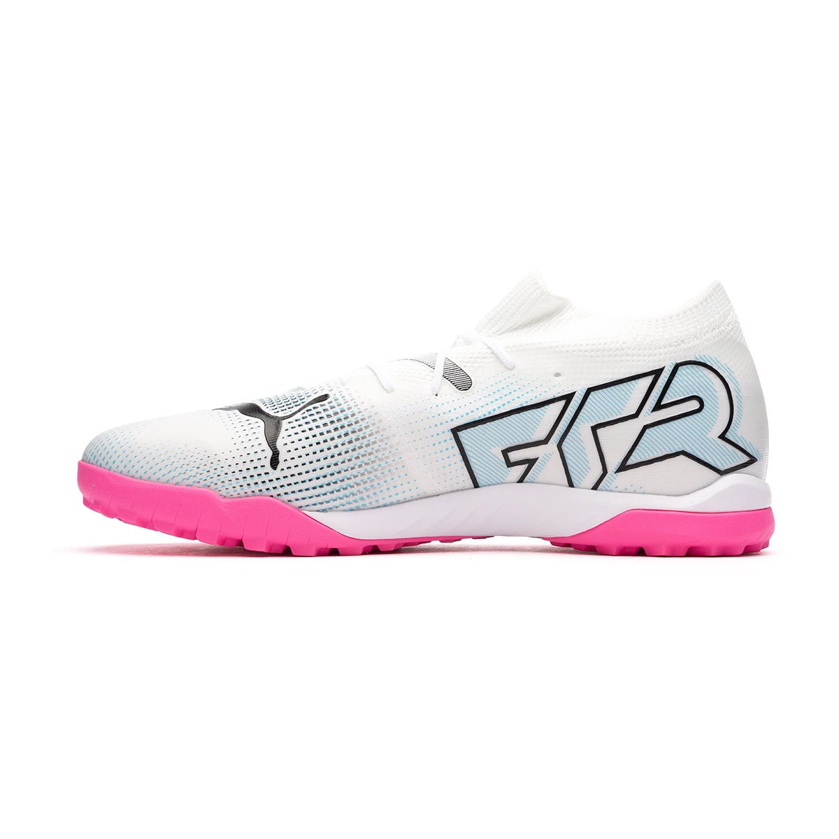 Chaussures de football Puma Future Match Turf. Chaussures synthétiques à utiliser sur les terrains en gazon artificiel et en moquette. Chaussures de milieu de gamme en White-Black-Poison Pink.