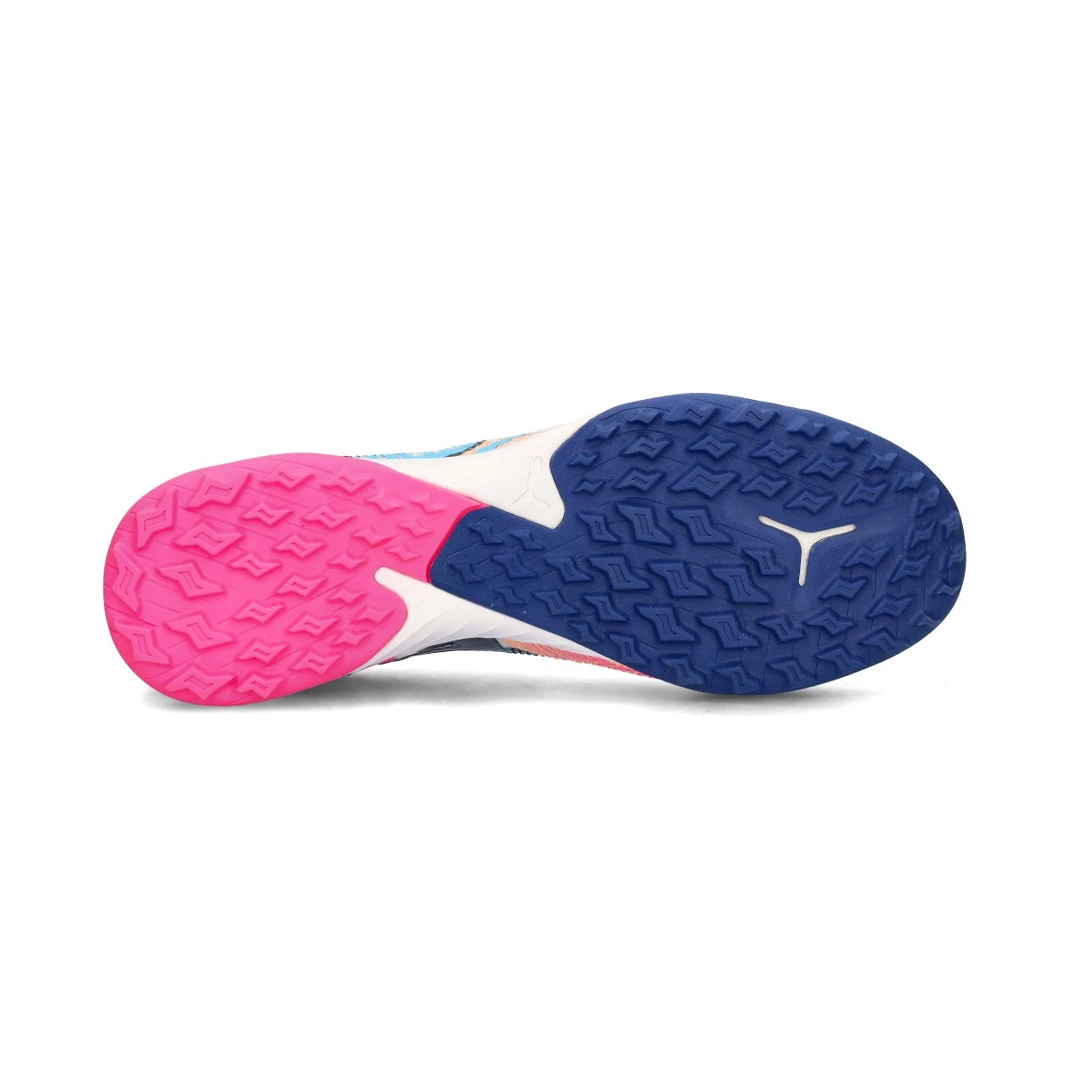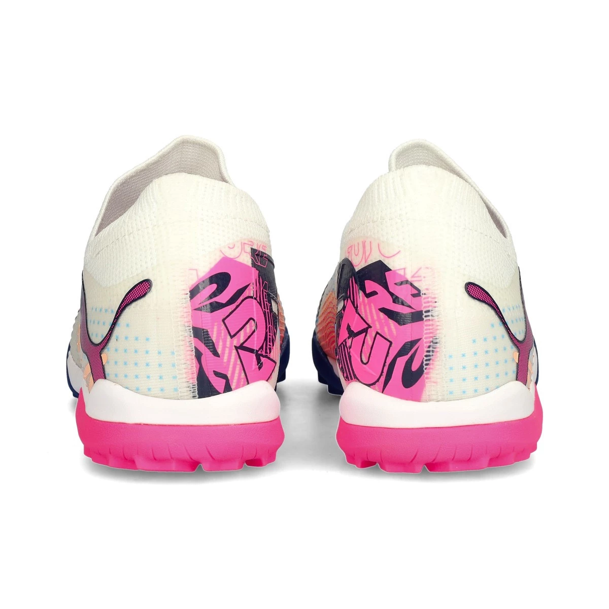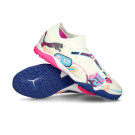 Chaussures de football Puma Future Match TT Turf. Chaussures synthétiques à utiliser sur les terrains en gazon artificiel et en tapis. Chaussures de milieu de gamme en coloris White-Luminous Blue-Poison Pink-Fizzy Melon.