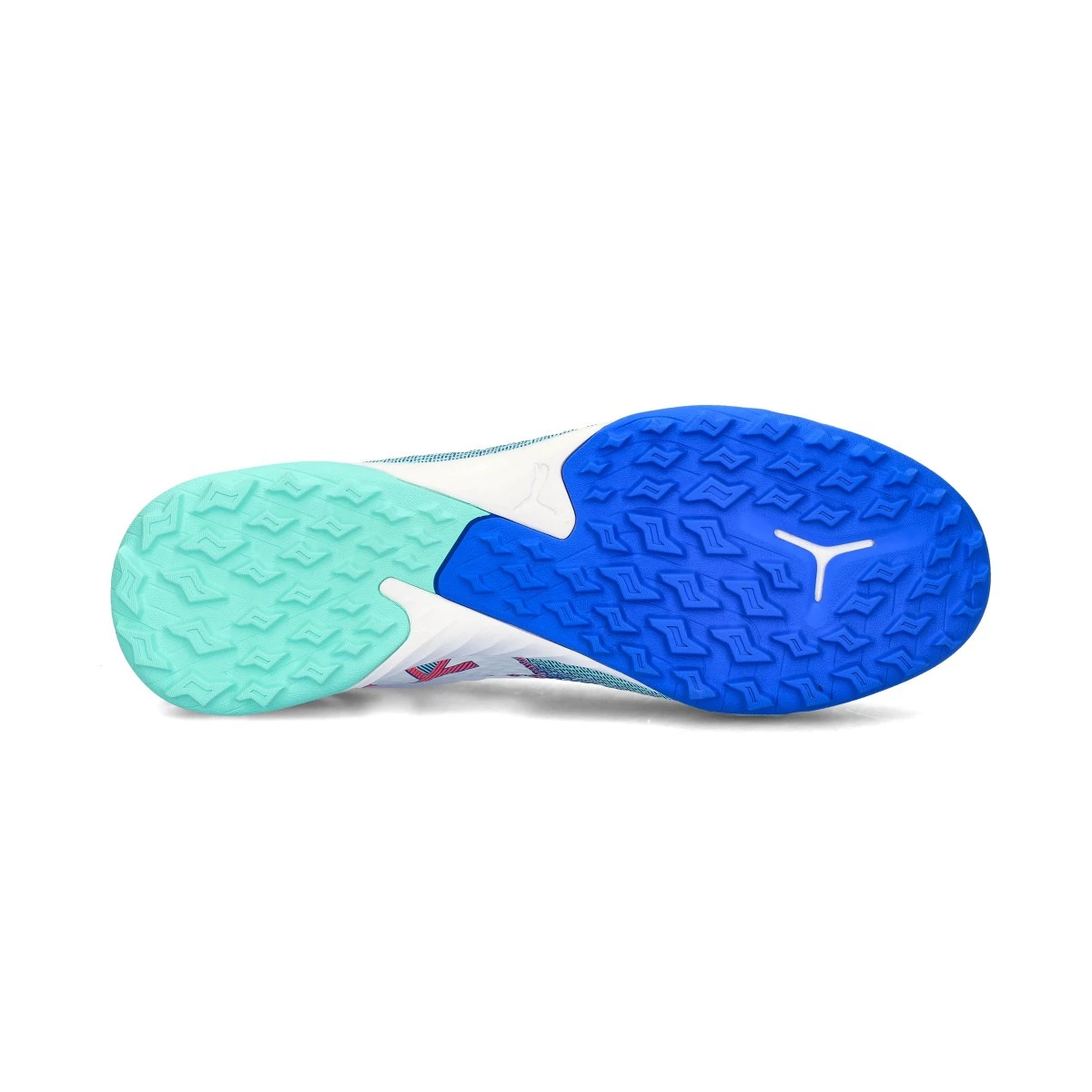 Chaussures de football Future 7 Pro Cage Turf. Chaussures en microfibre pour une utilisation sur tapis et terrains en terre battue. Chaussures haut de gamme en couleur Bluemazing-White-Electric Peppermint.