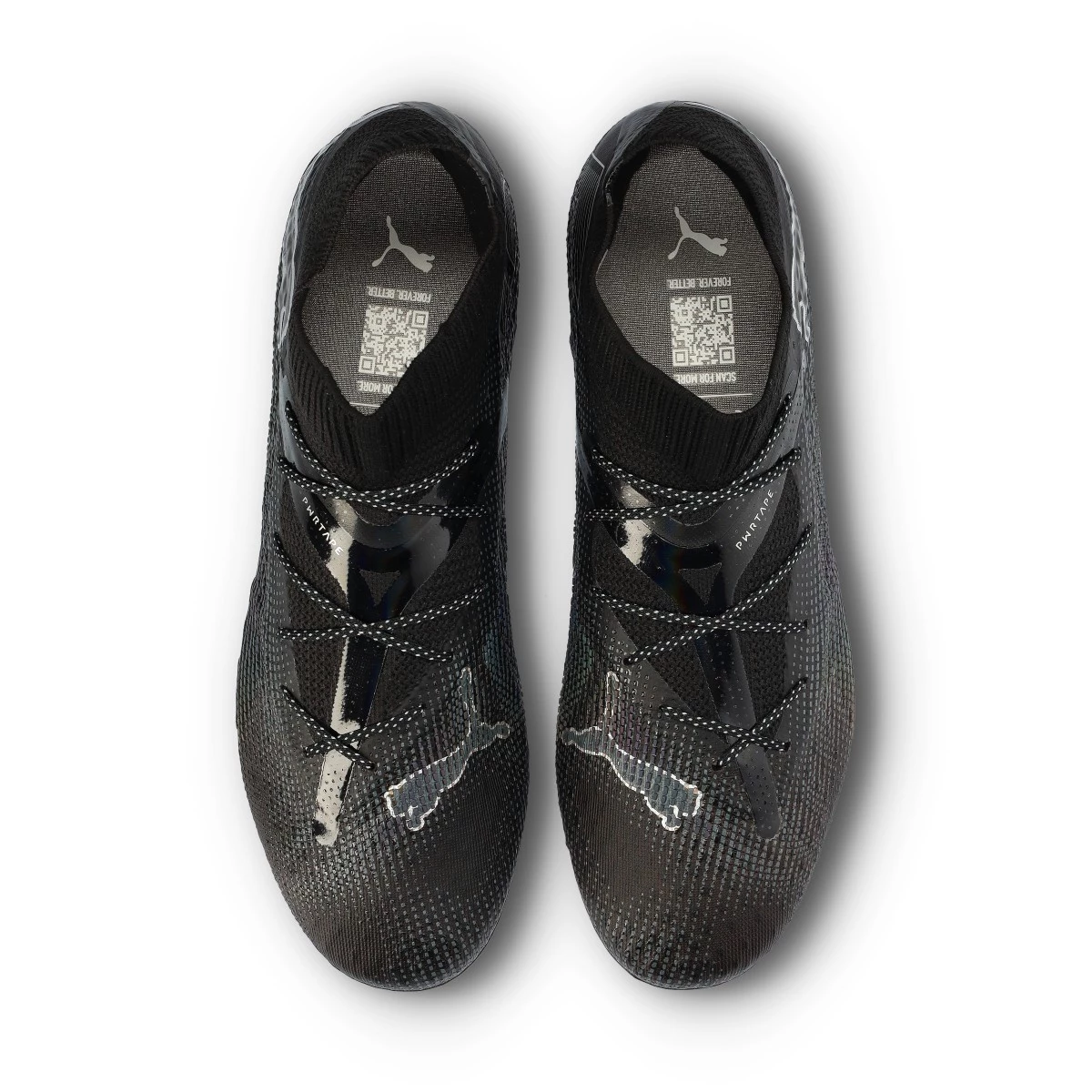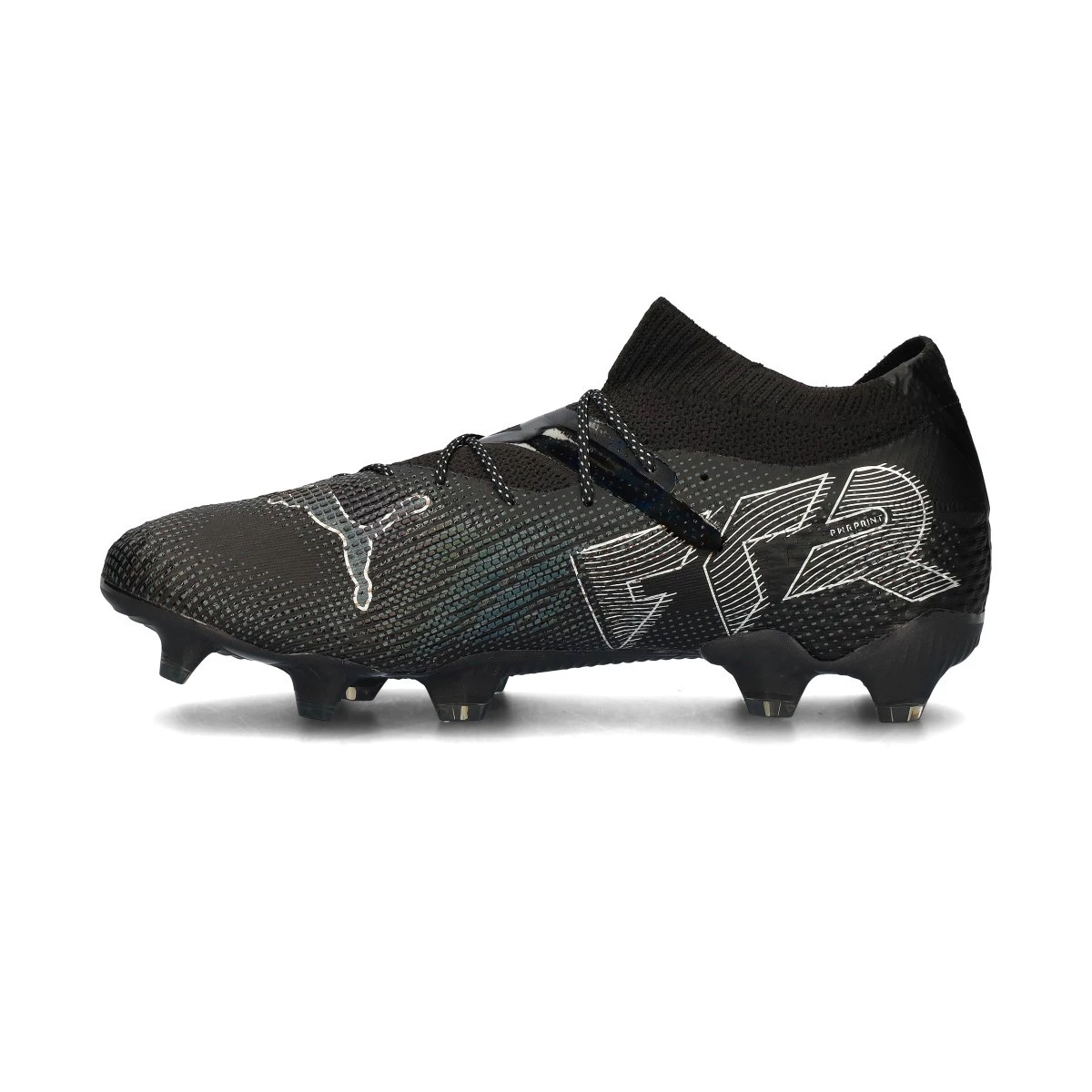 Chaussures de football Puma Future 7 Ultimate FG/AG. Chaussures en fil, à utiliser sur les terrains en gazon naturel sec ou humide et sur les terrains en gazon artificiel de dernière génération. Chaussures haut de gamme en Black-Silver Gray-Shadow Gray.