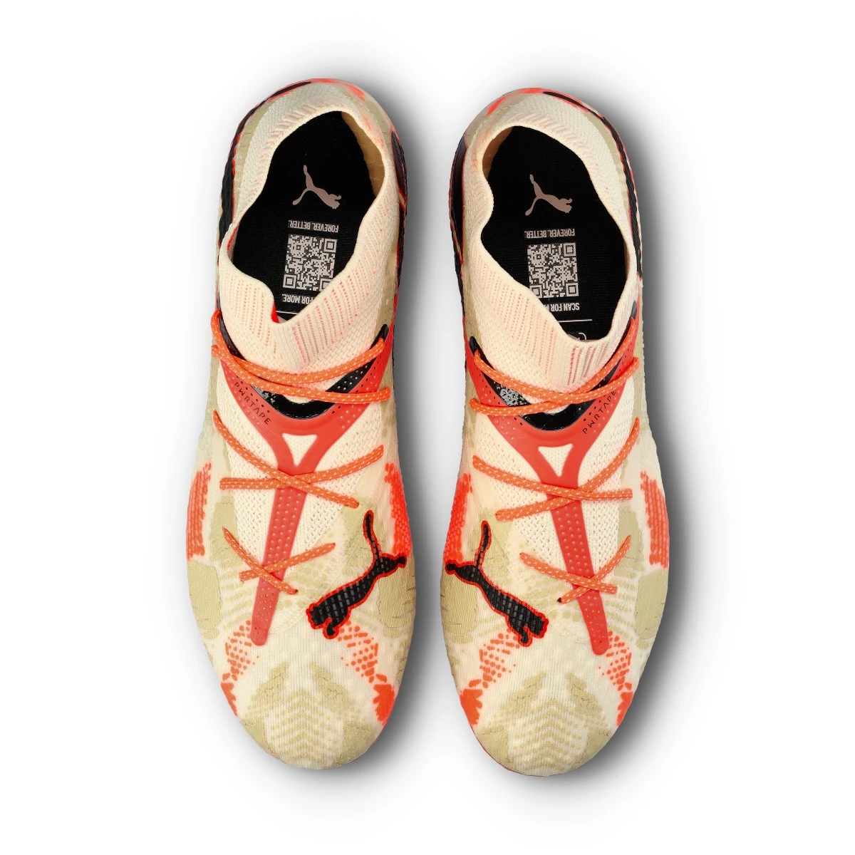 Chaussures de football Puma Future 7 Ultimate FG/AG. Chaussures en fil à utiliser sur les terrains en gazon naturel sec ou humide et sur les terrains en gazon artificiel de dernière génération. Chaussures haut de gamme en coloris Alpine Snow-Noir-Amande grillée-Noir.