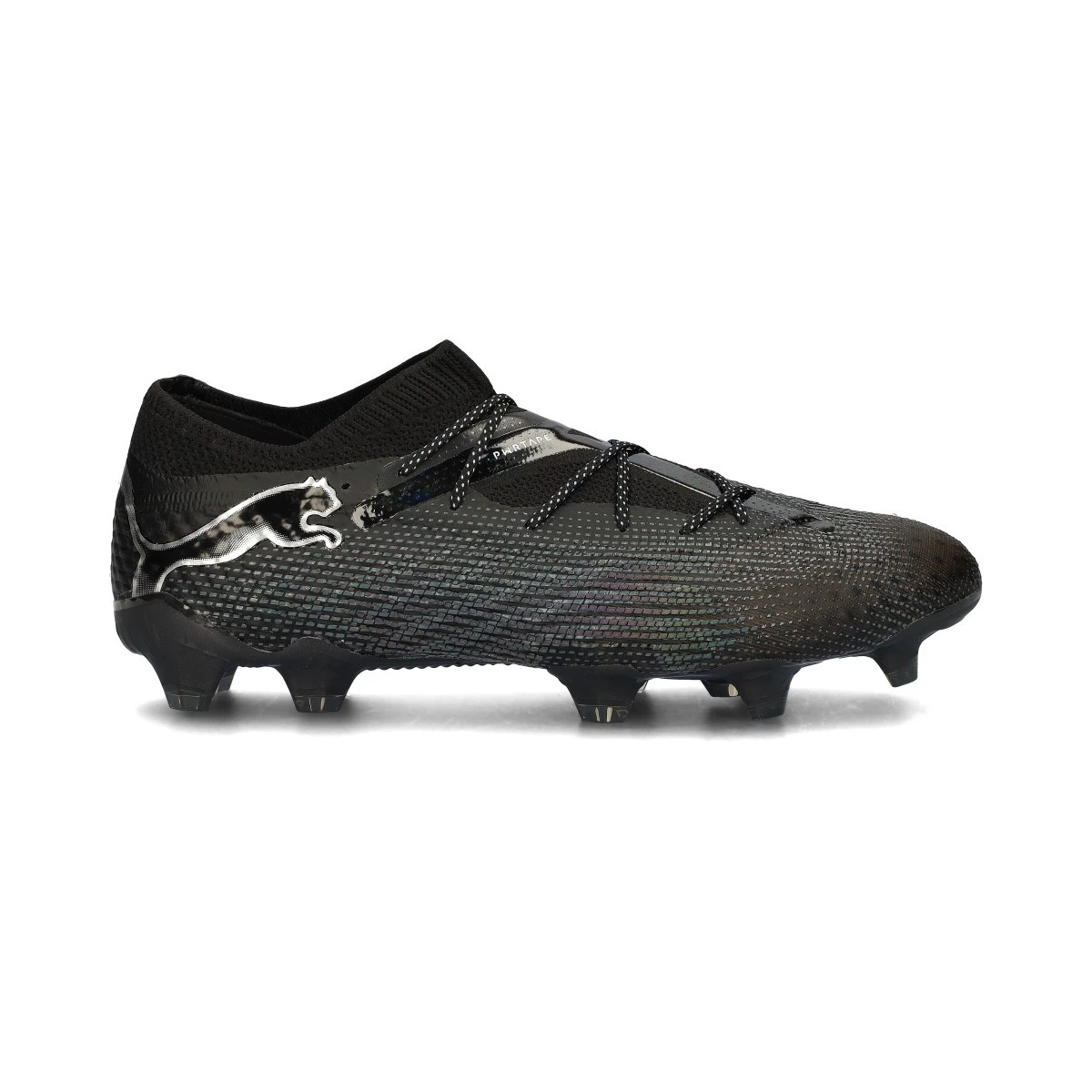 Chaussures de football Puma Future 7 Ultimate Low FG/AG. Chaussures en fil, à utiliser sur les terrains en gazon naturel sec ou humide et sur les terrains en gazon artificiel de dernière génération. Chaussures haut de gamme en Black-Silver Gray-Shadow Gray.