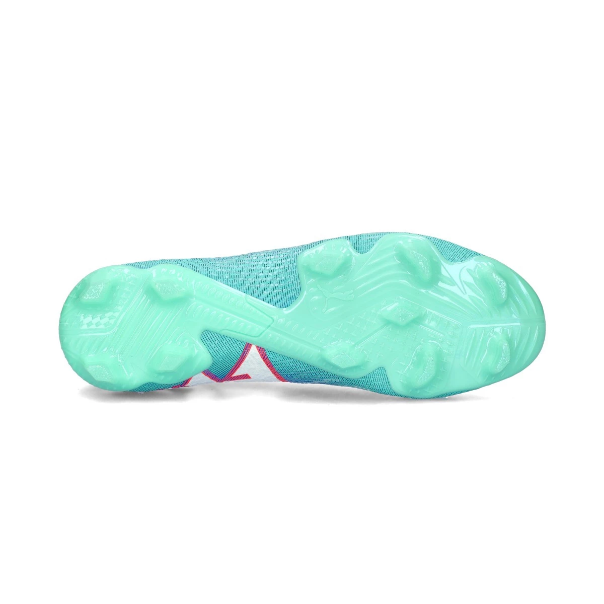 Chaussures de football Puma Future 7 Ultimate Low FG/AG. Chaussures en fil, à utiliser sur les terrains en gazon naturel sec ou humide et pour les terrains en gazon artificiel de dernière génération. Chaussures haut de gamme en coloris Bluemazing-White-Electric Peppermint.