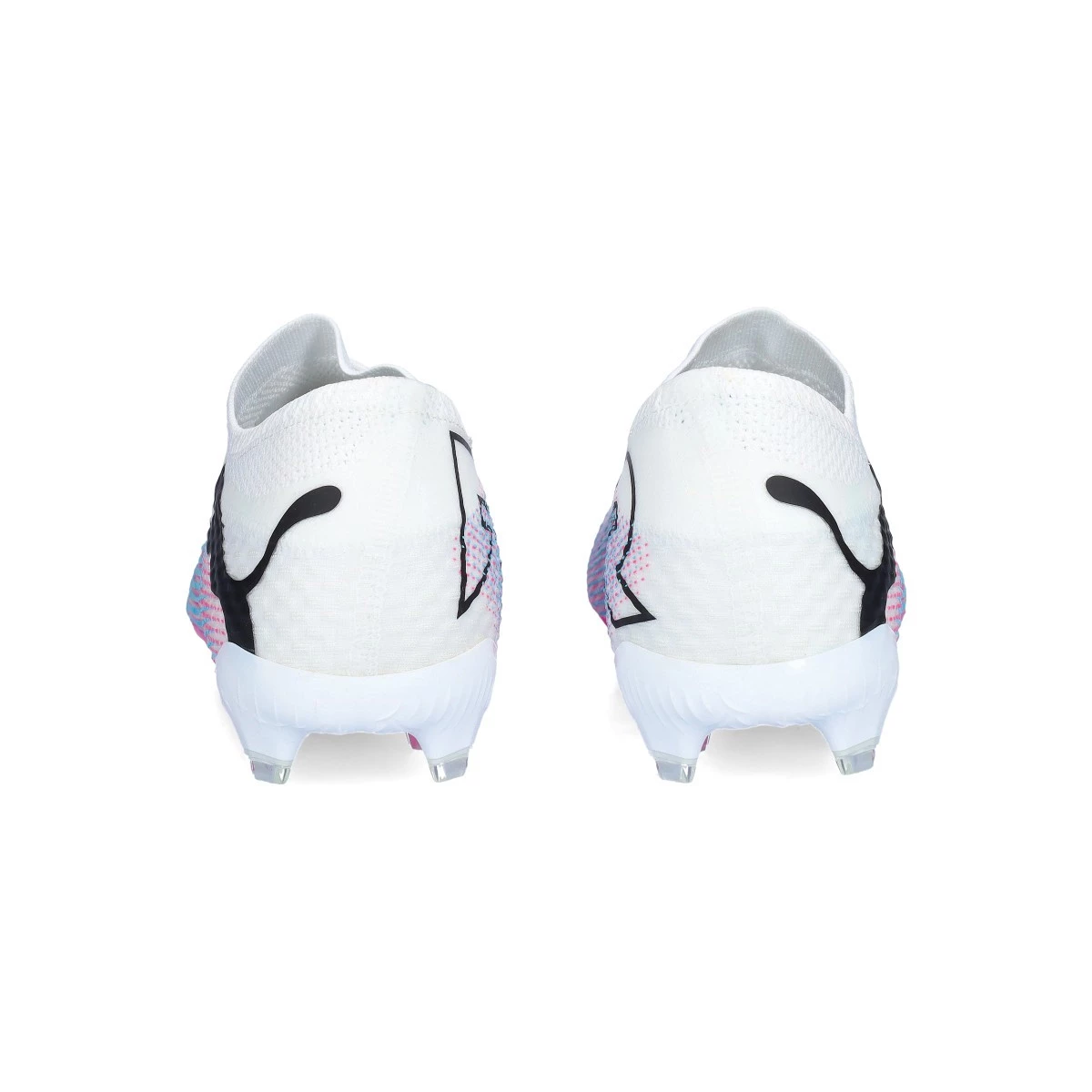 Chaussures de football Future 7 Ultimate Low FG/AG. Chaussures en fil, à utiliser sur des terrains en gazon naturel secs ou humides, et sur des terrains en gazon artificiel à la pointe de la technologie. Chaussures haut de gamme en White-Black-Poison Pink-Bright Aqua-Silver Mi