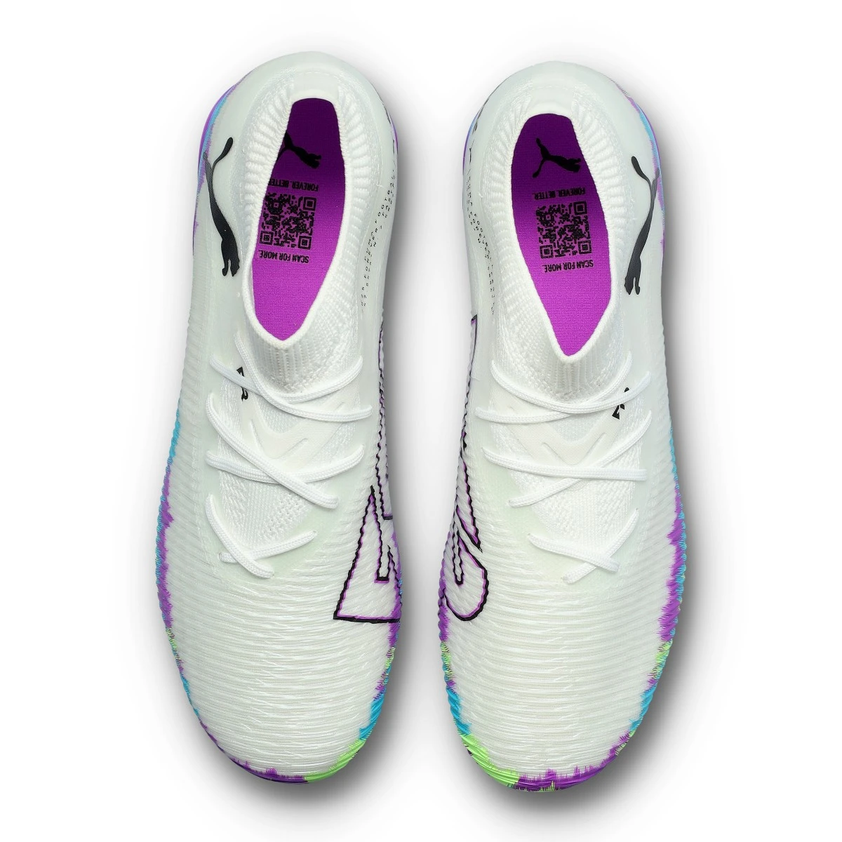 Chaussures de football Puma Future 8 Match FG/AG pour femmes. Chaussures synthétiques à utiliser sur les terrains en gazon artificiel et naturel. Chaussures basses en White-Fizzy Apple-Ultra Blue-Pure Magent.