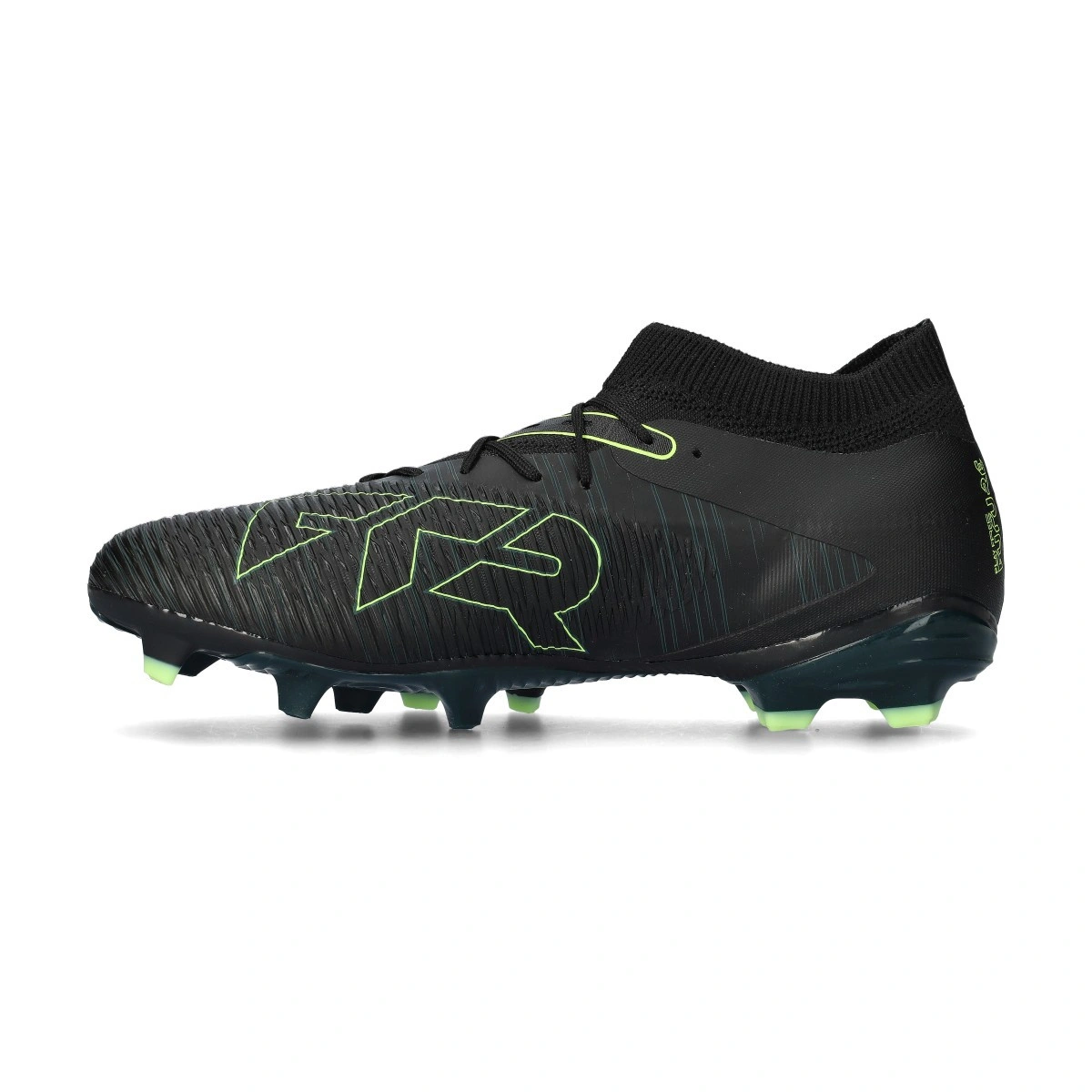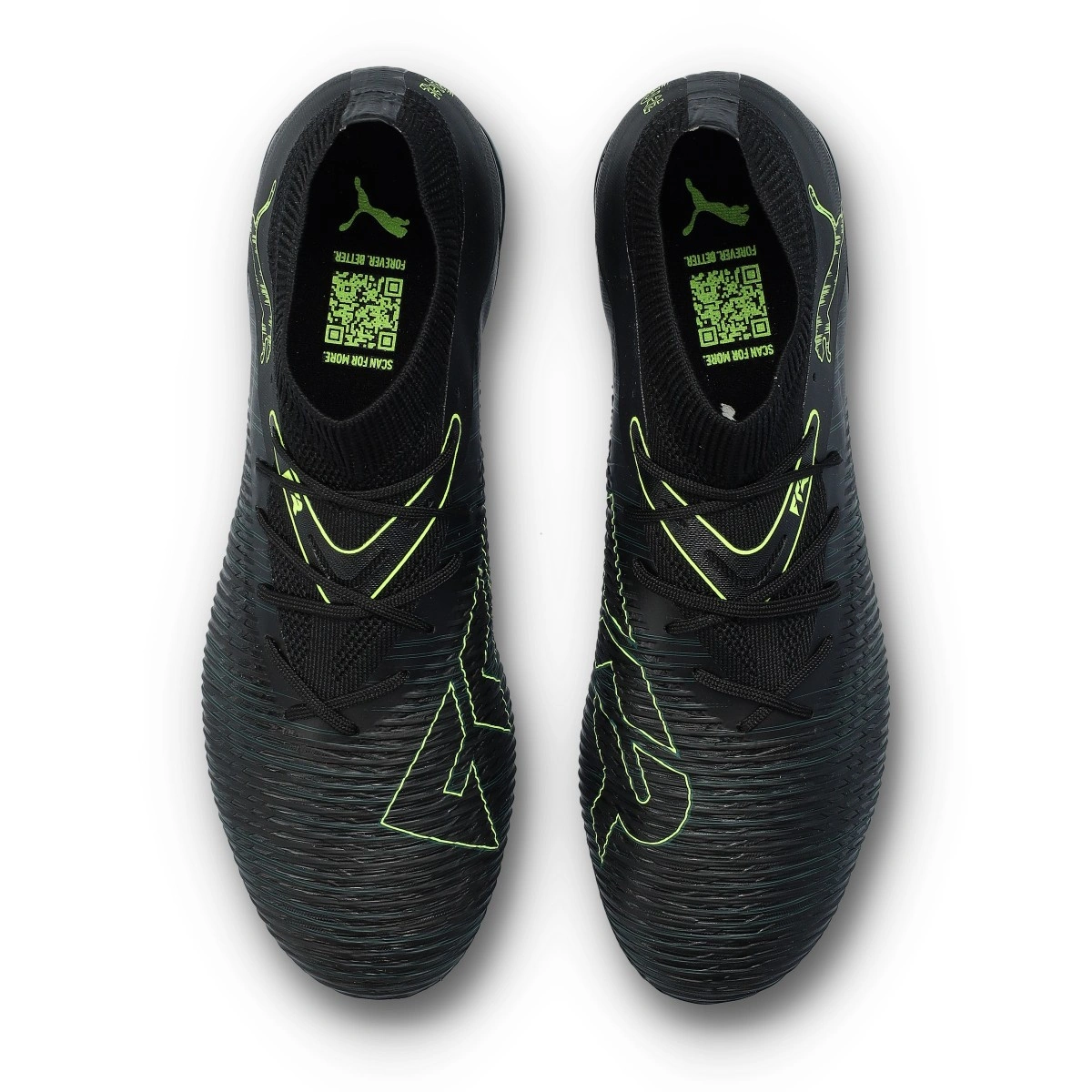 Chaussure de football Puma Future 8 Match FG/AG. Chaussures synthétiques à utiliser sur les terrains à gazon artificiel et naturel. Chaussures bas de gamme en couleur Black-Fizzy Light-Green Terrain.