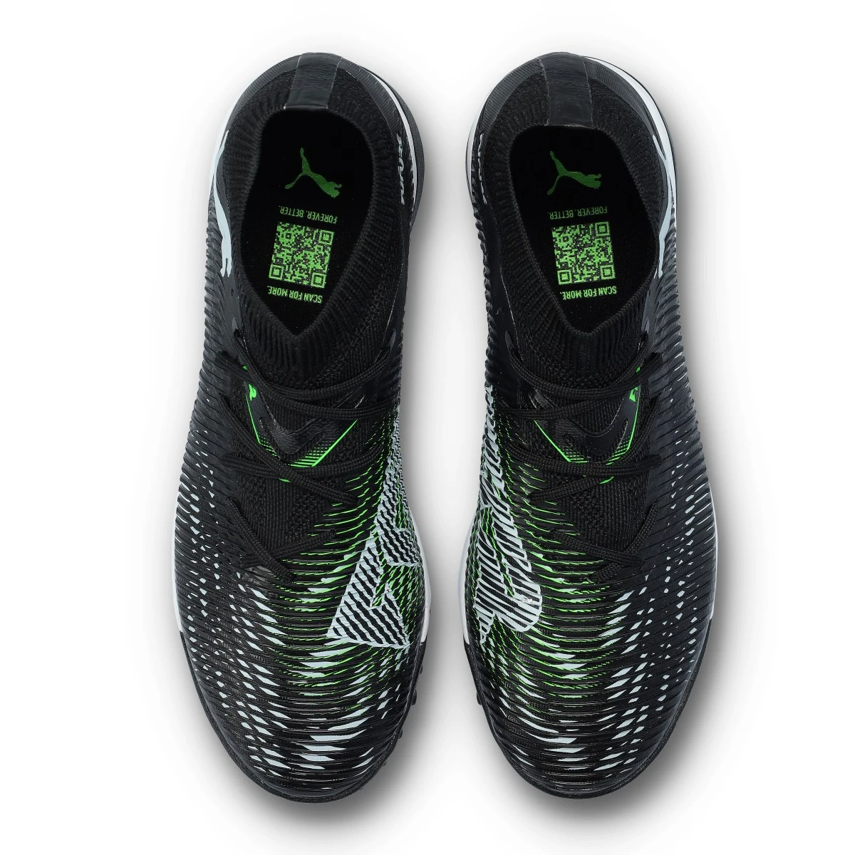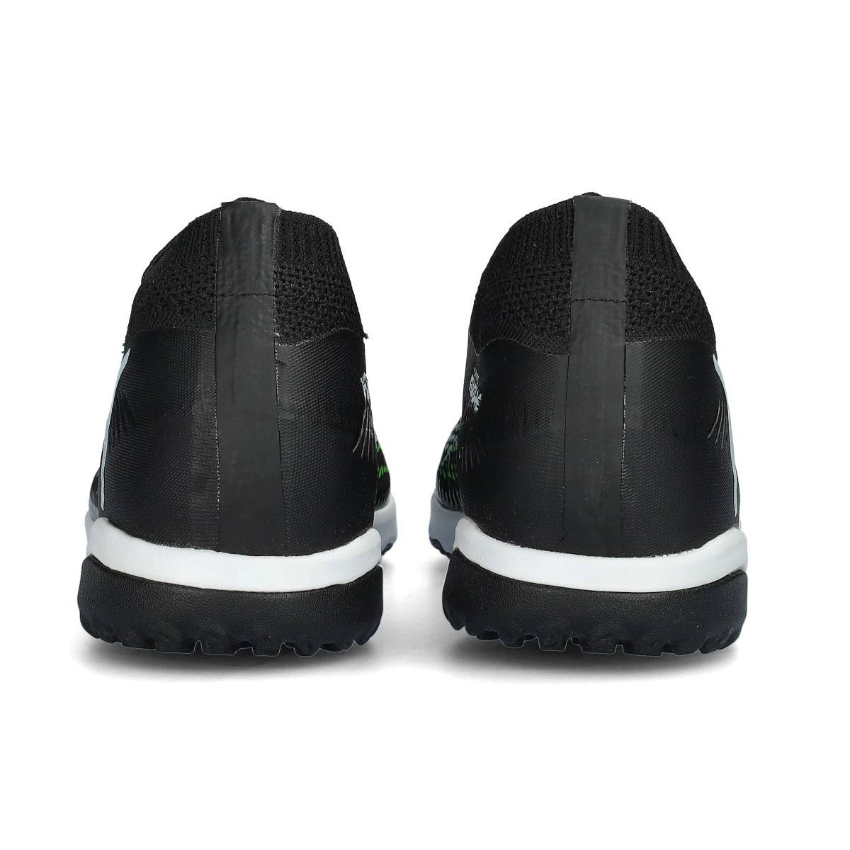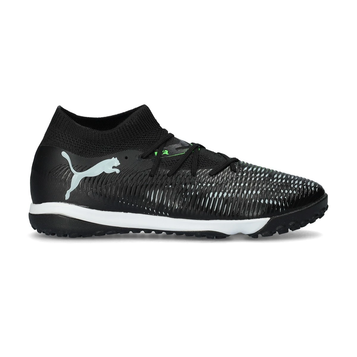 Chaussures de football Puma Ultra 8 5Match Turf pour adultes. Chaussures synthétiques à utiliser sur des terrains en gazon artificiel ou en moquette. Chaussures bas de gamme en Black-Silver-Fluo Green.