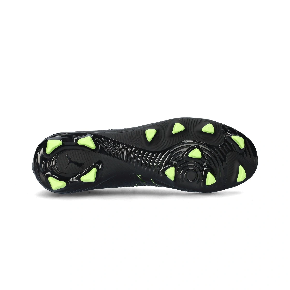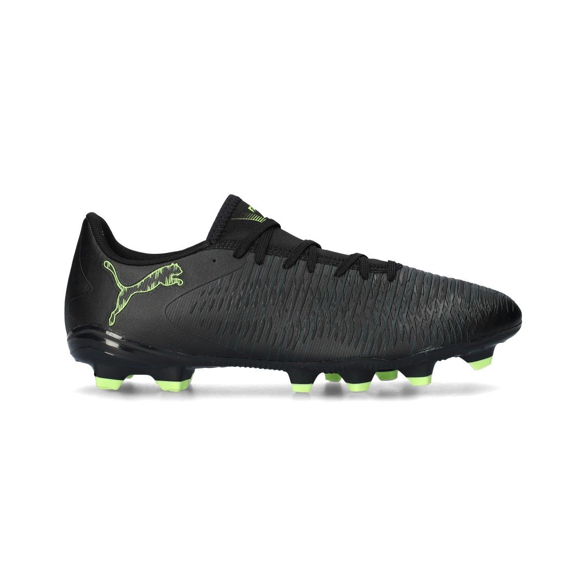 Chaussure de football Puma Future 8 Play FG/AG. Chaussures synthétiques à utiliser sur les terrains à gazon artificiel et naturel. Chaussures bas de gamme en couleur Black-Fizzy Light-Green Terrain.