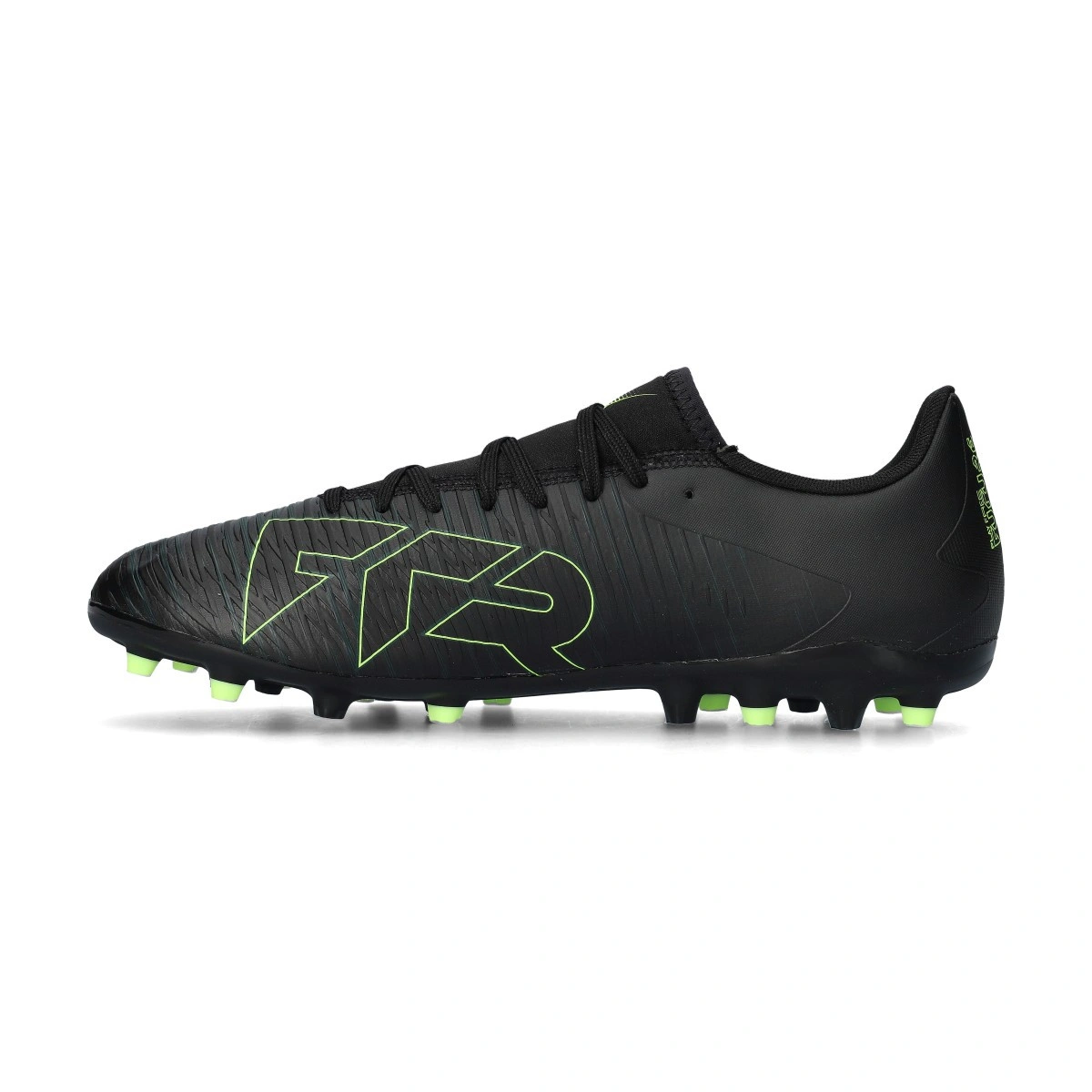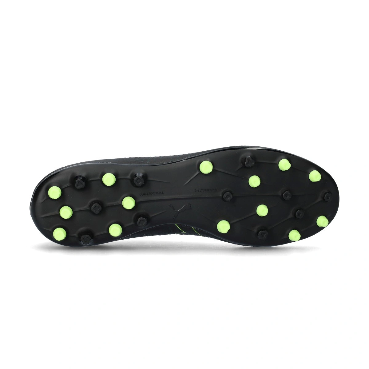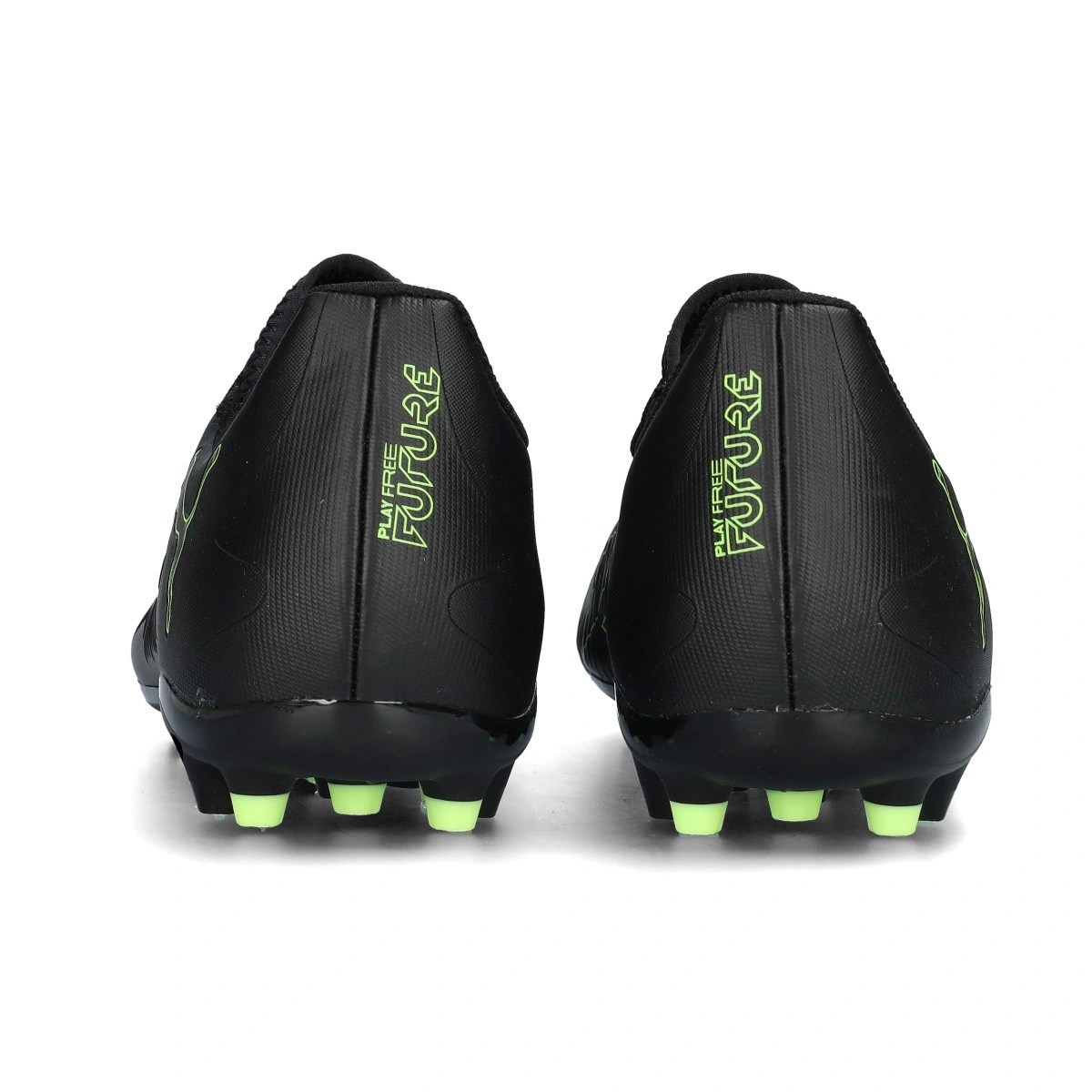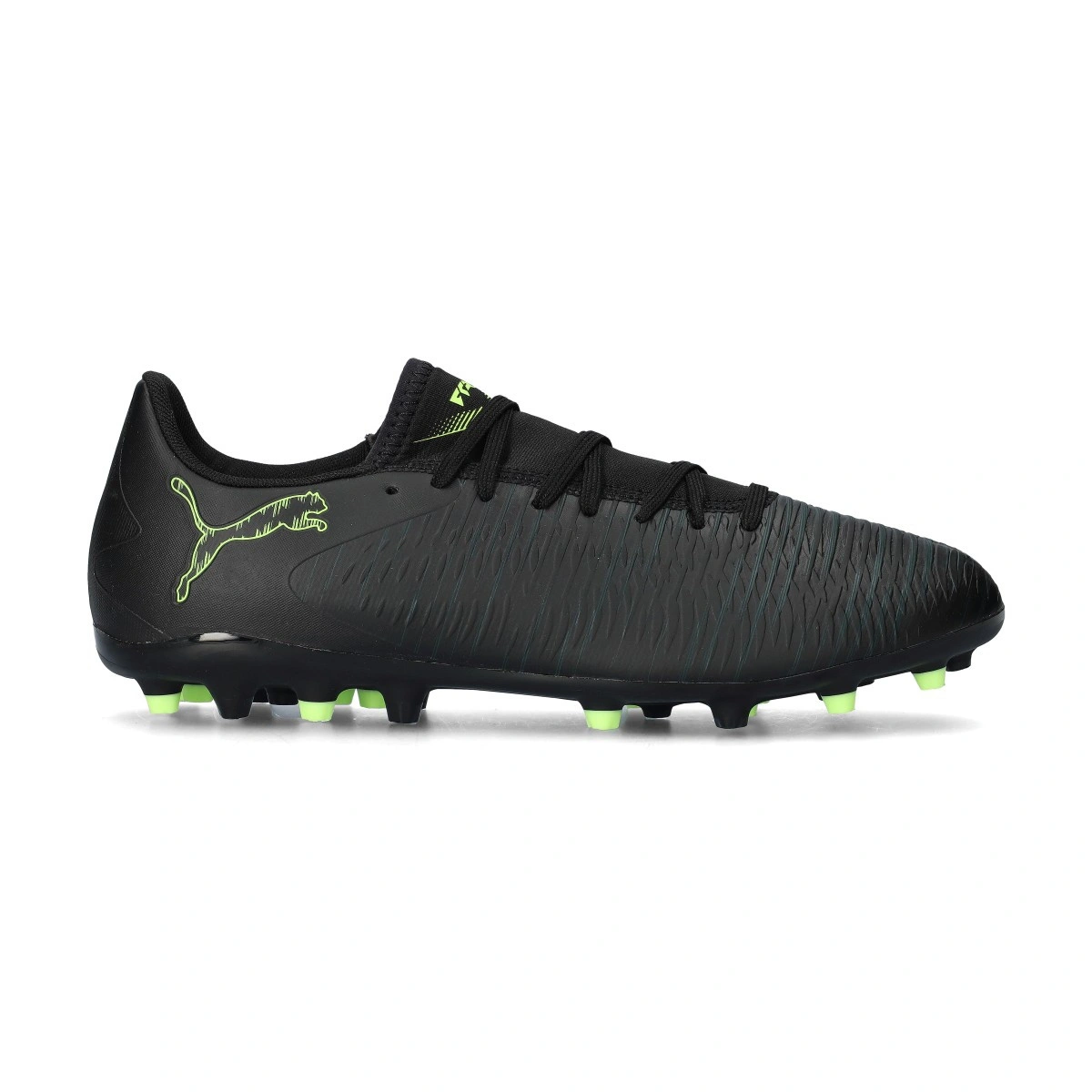 Chaussure de football Puma Future 8 Play MG. Chaussures synthétiques à utiliser sur les terrains à gazon artificiel. Chaussures bas de gamme en couleur Black-Fizzy Light-Green Terrain.