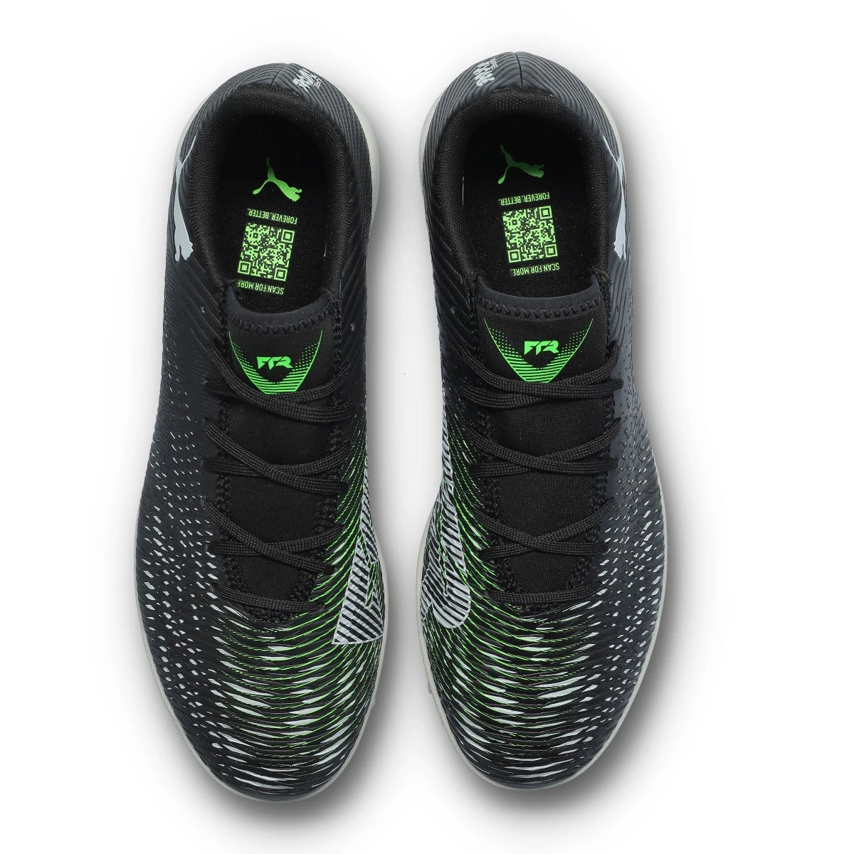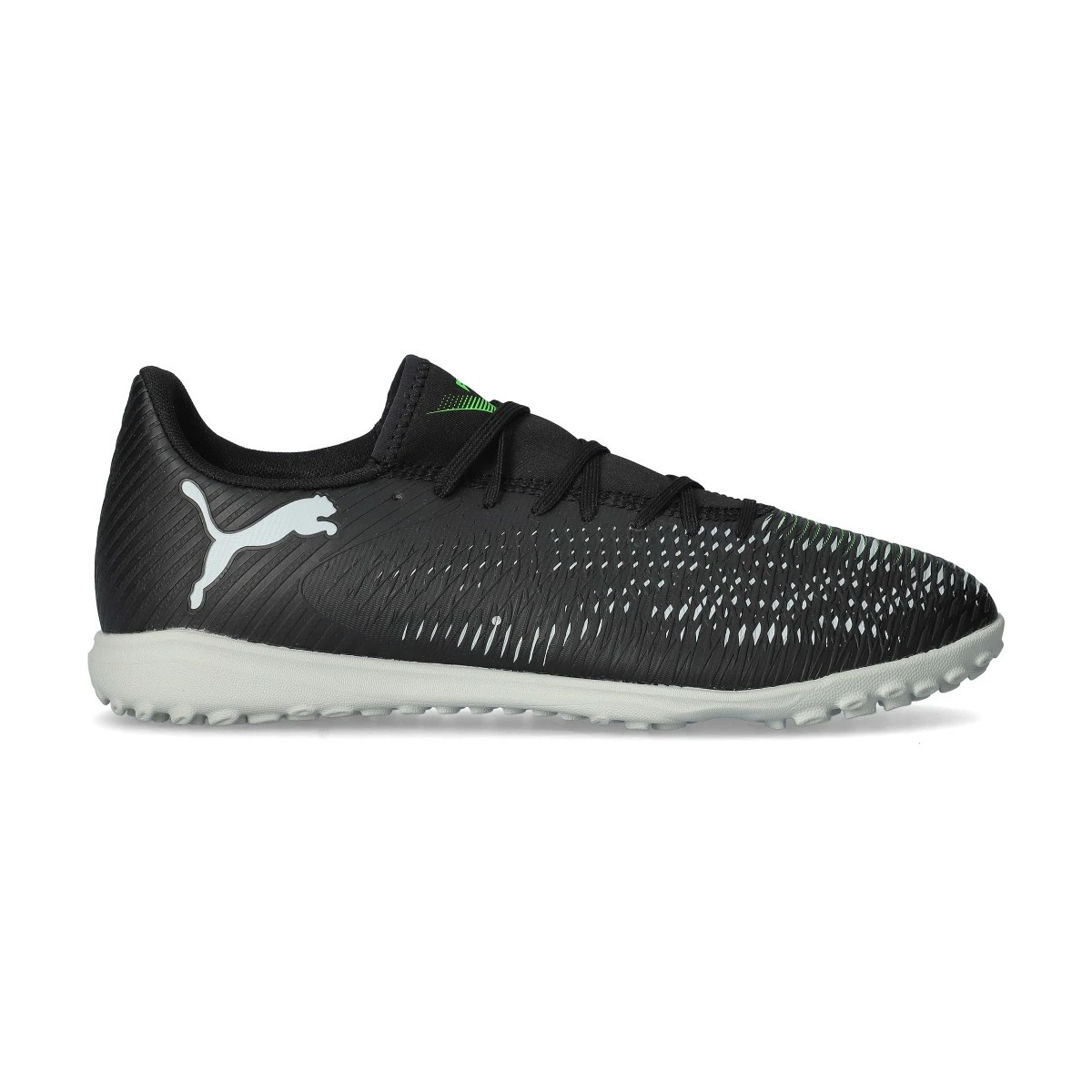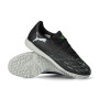 Chaussure de football Future 8 Play Turf. Chaussures à lacets en microfibre synthétique pour utilisation sur moquette, gazon artificiel, béton ou terrains en terre battue. Chaussures haut de gamme en Black-Silver-Fluo Green.