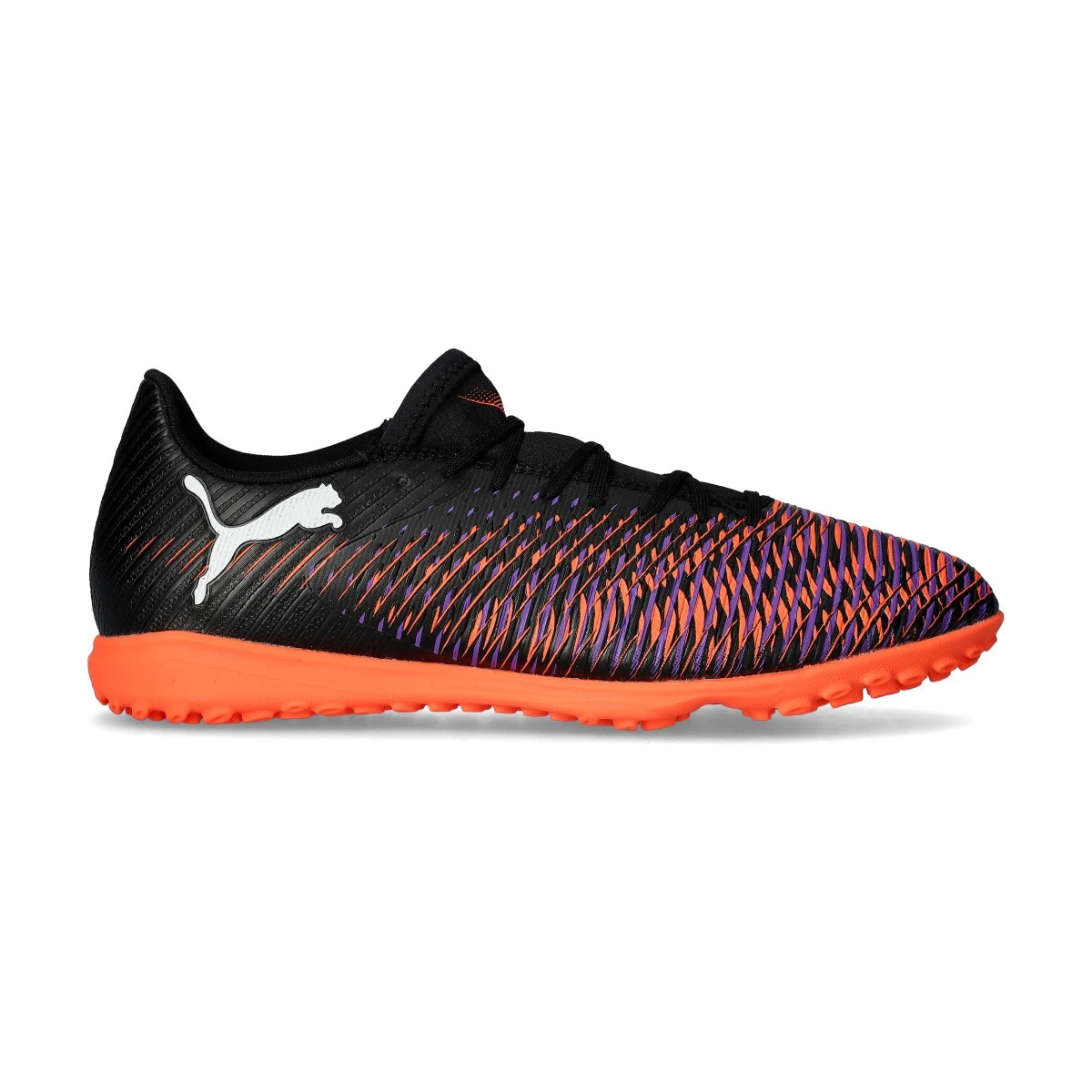 Chaussure de football Future 8 Play Turf. Chaussures en microfibre synthétique sans lacets avec bande adhésive pour utilisation sur moquette, gazon artificiel, terrain en béton ou en terre battue. Chaussures haut de gamme en Black-White-Glowing Red.