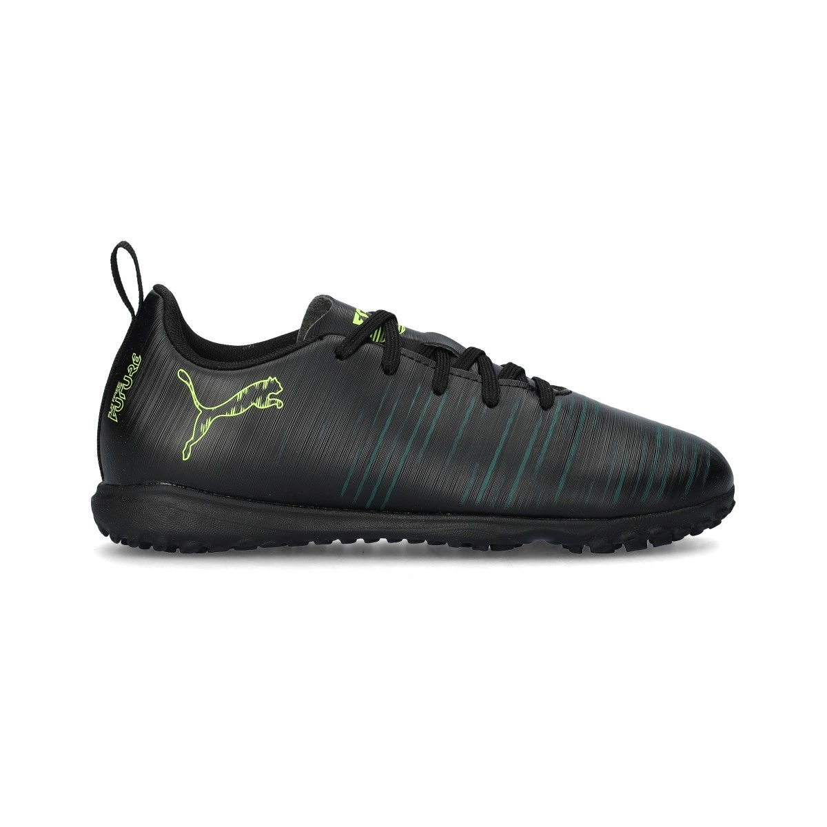 Chaussure de football Puma Future 8 Play Turf. Chaussures en microfibre à lacets à utiliser sur les terrains à gazon artificiel, béton, moquette et terre. Chaussures bas de gamme en couleur Black-Fizzy Light-Green Terrain.