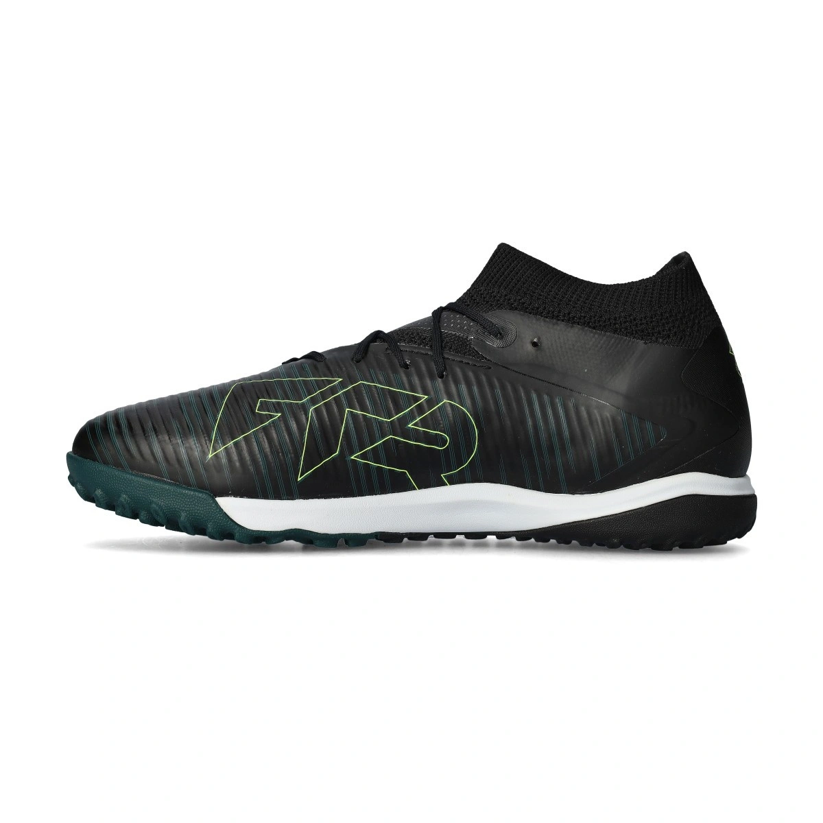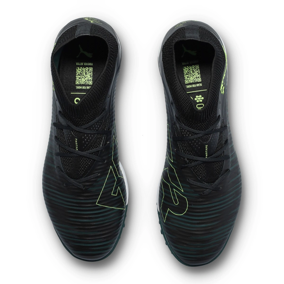Chaussure de football Puma Future 8 Pro Cage Turf. Chaussures en microfibre à utiliser sur les terrains en terre ou moquette. Chaussures haut de gamme en couleur Black-Fizzy Light-Green Terrain.