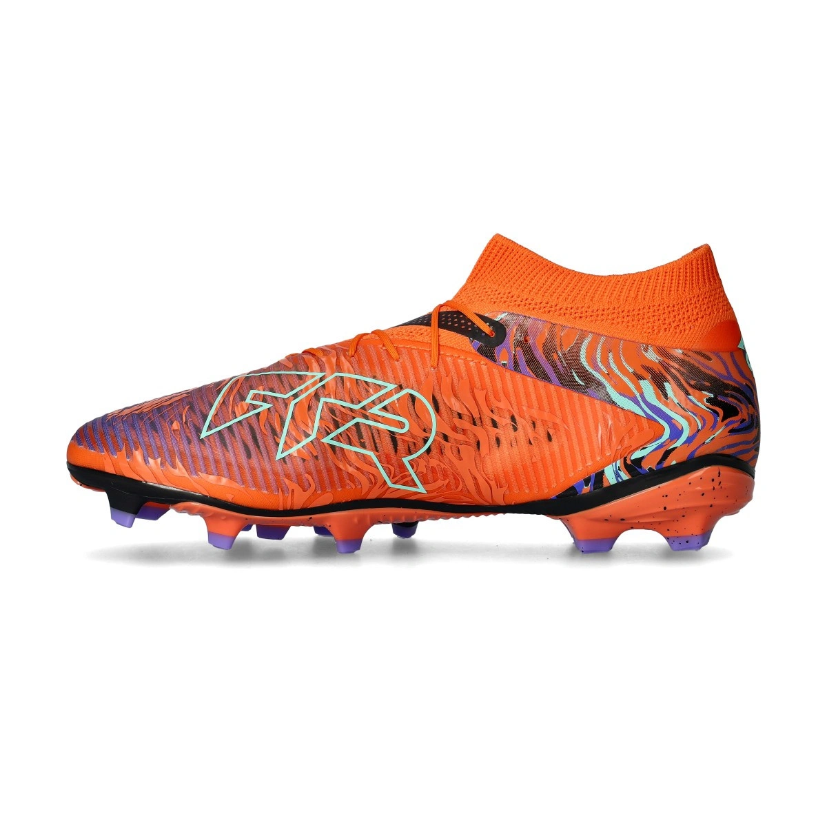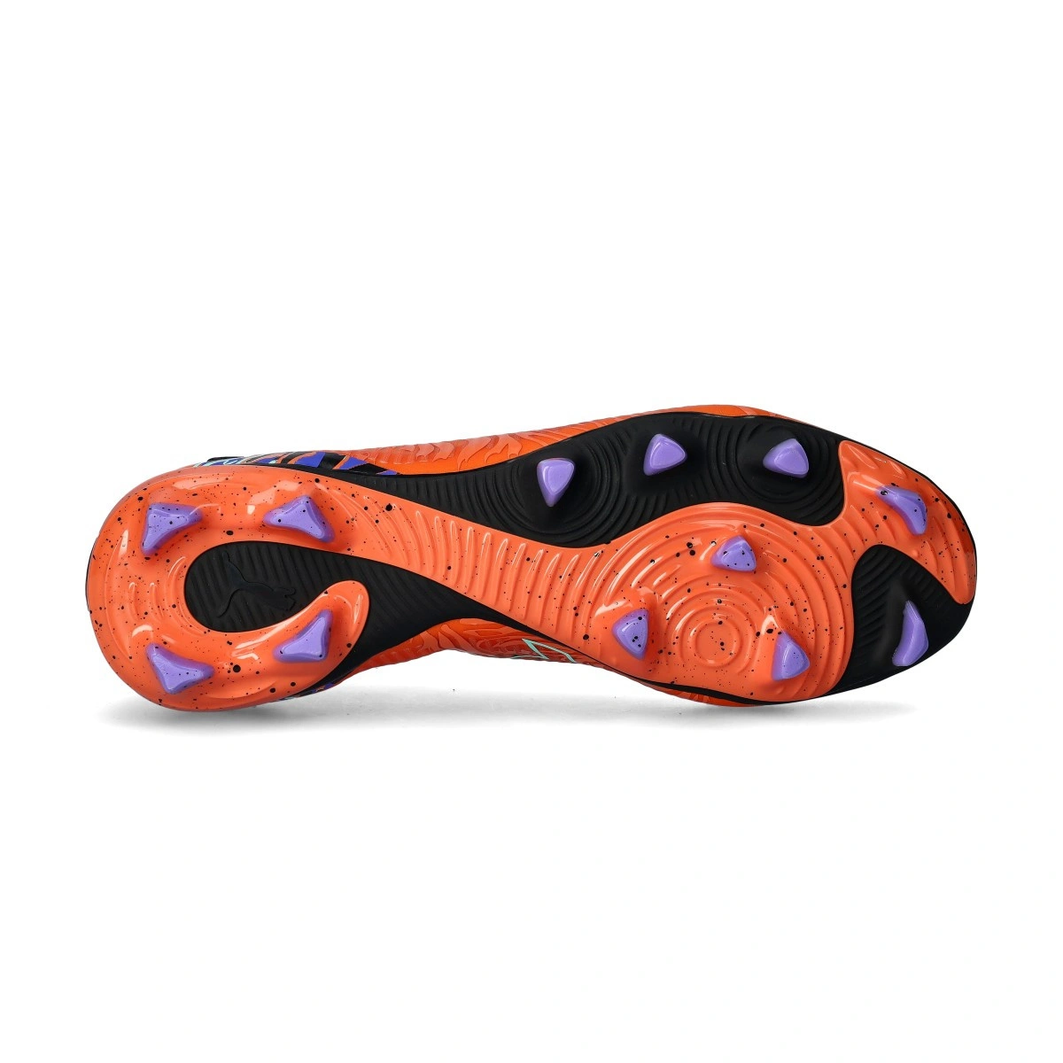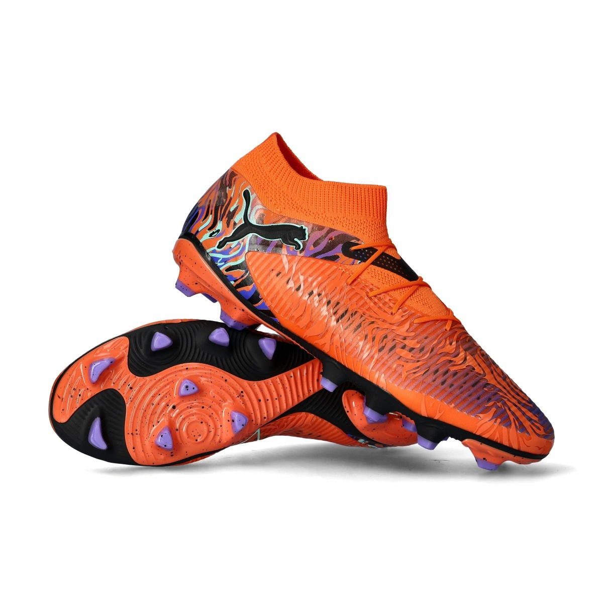 Chaussures de foot Puma Future 8 Pro FG/AG. Chaussures filetées à utiliser sur gazon artificiel. Chaussures hautes de gamme en coloris Orange Poppy-Black-Poison Pink.