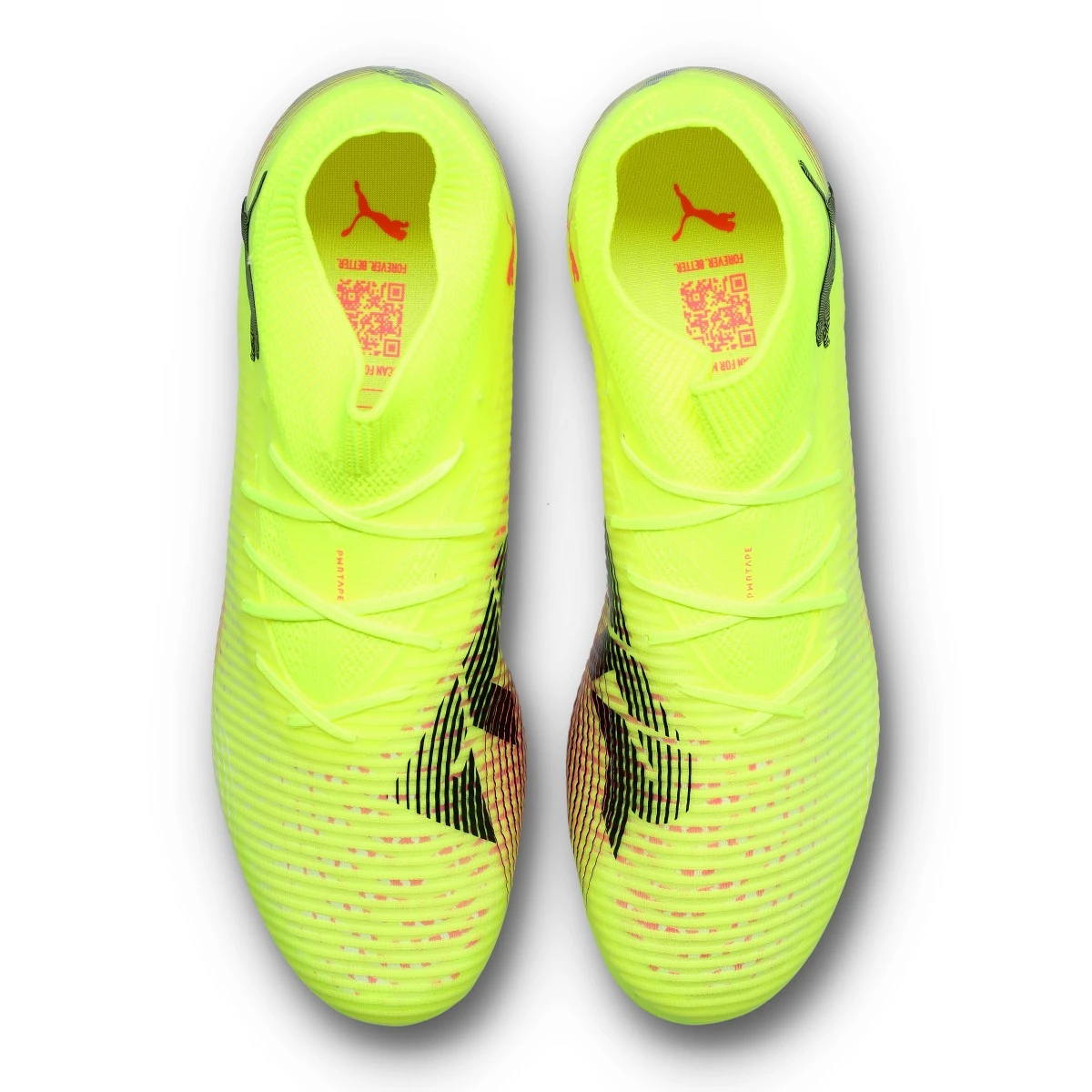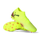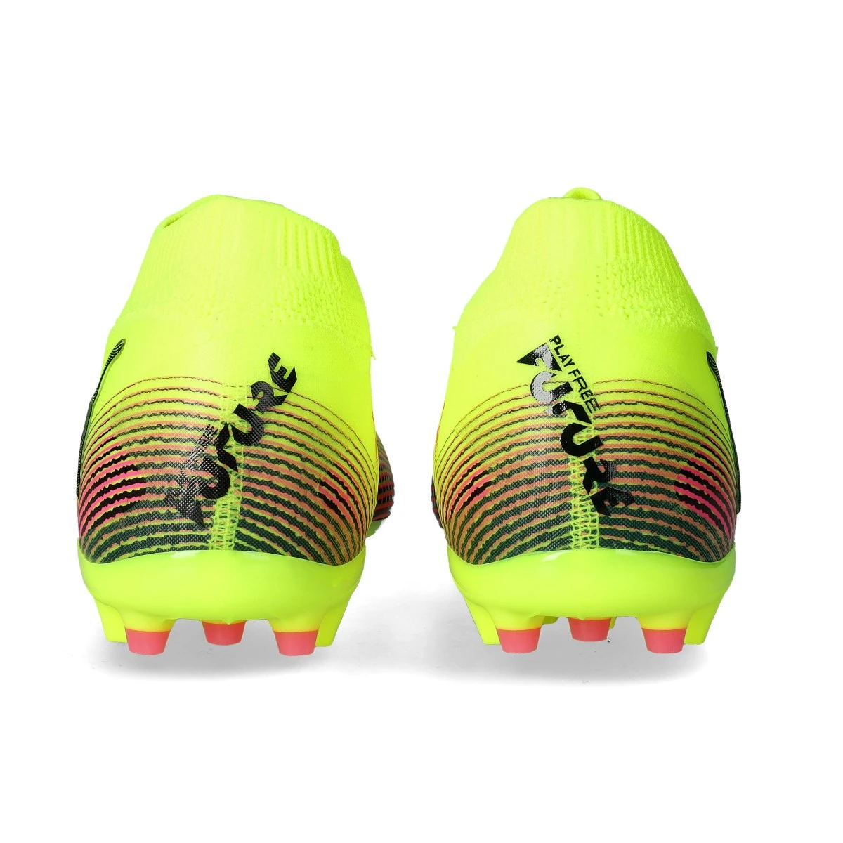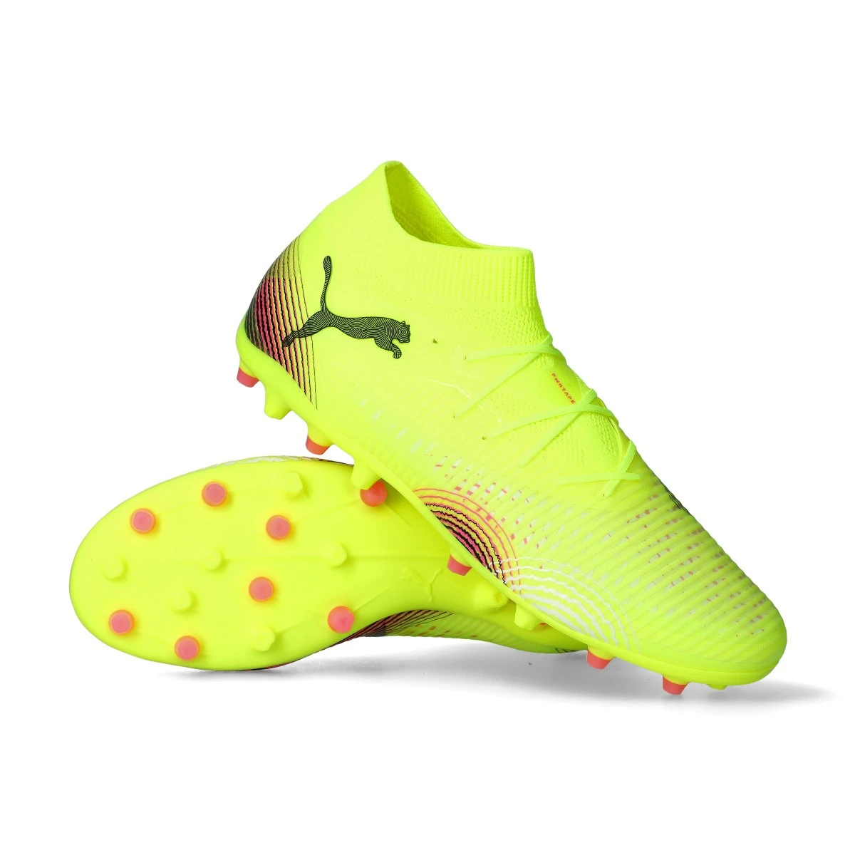 Chaussures de football Puma Future 8 Pro MG. Chaussures en microfibre pour utilisation sur les terrains en gazon artificiel de première génération. Chaussures de milieu de gamme en coloris Yellow Alert-Puma Black-Sun Struck.