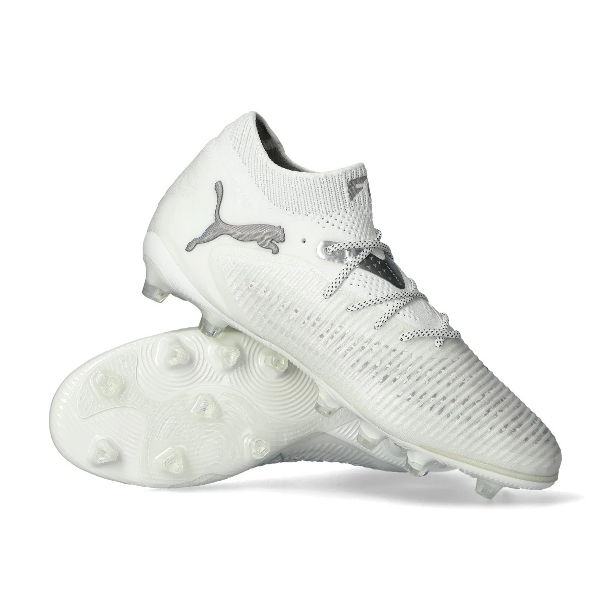 Chaussures de football Puma Future 8 Ultimate AG. Chaussures filetées, à utiliser sur les terrains en gazon artificiel. Chaussures haut de gamme en White-Silver Mist-Cool Light Gray.