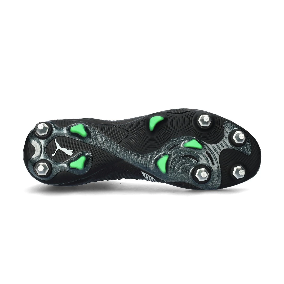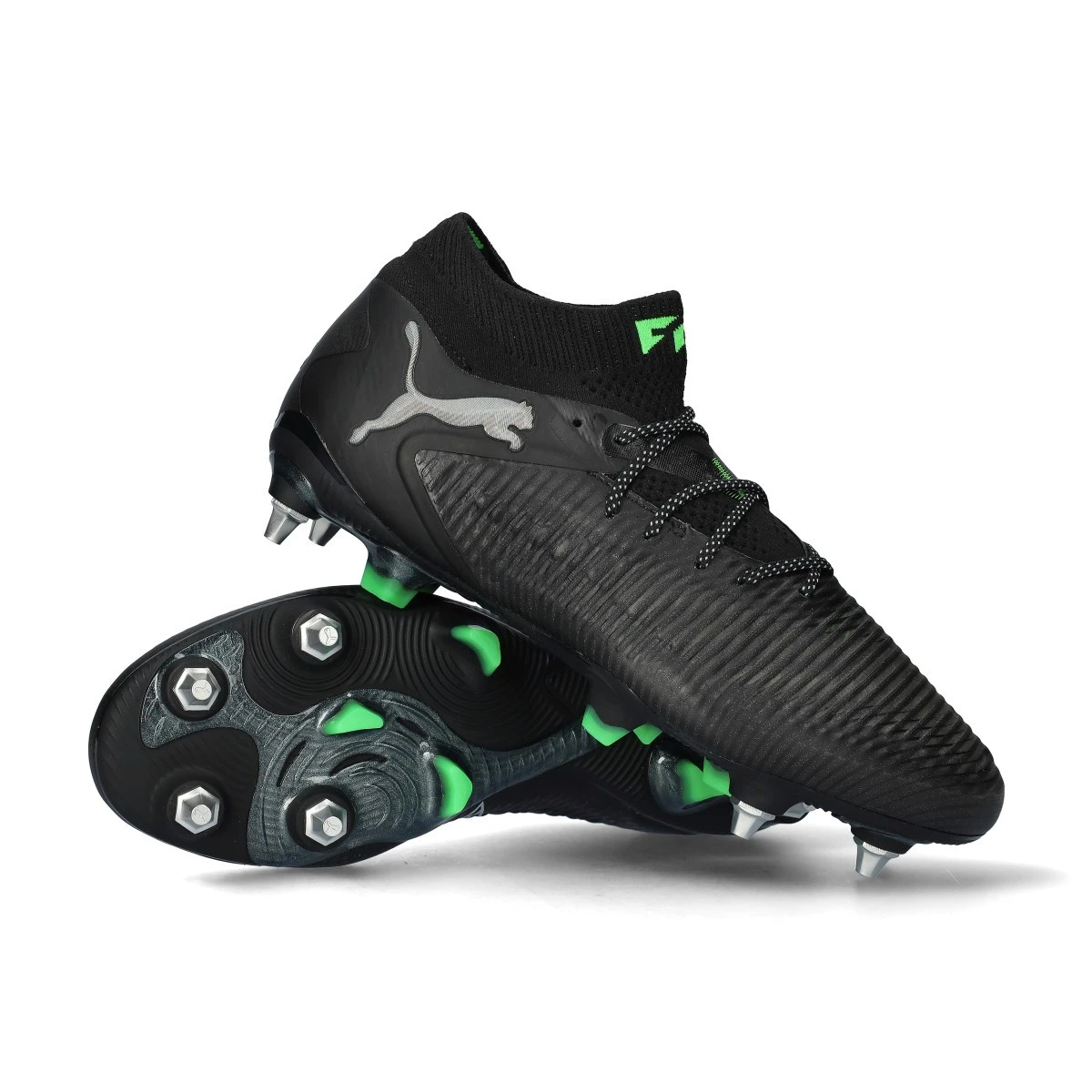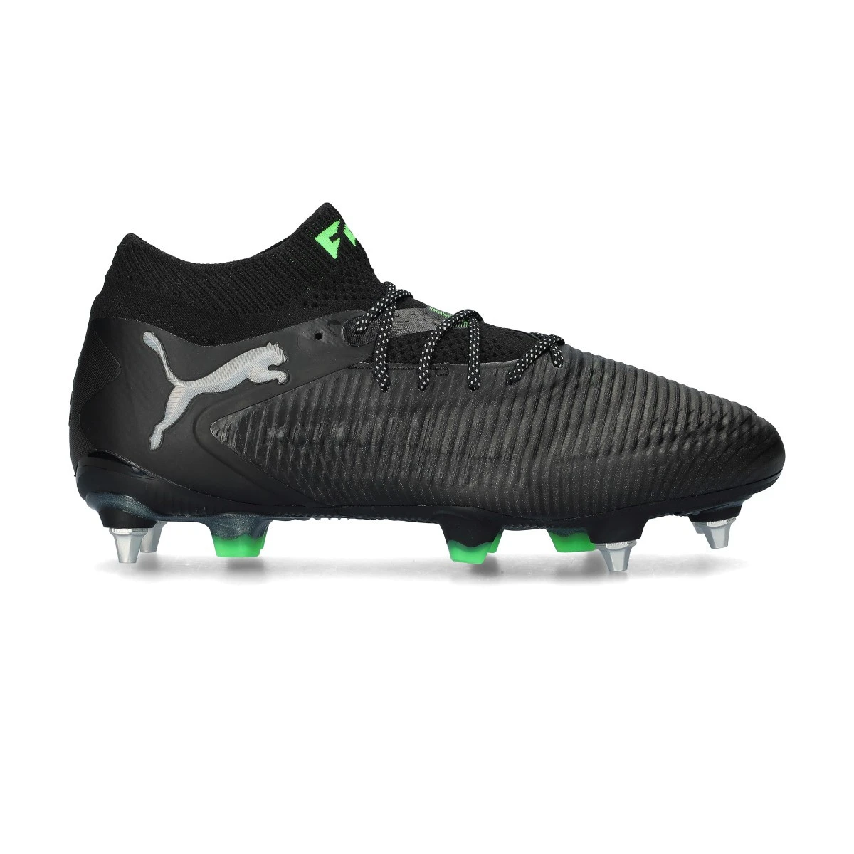 Chaussures de football Puma Future 8 Ultimate MxSG. Chaussures filetées, à utiliser sur les terrains en gazon naturel nettement humide. Chaussures haut de gamme en Black-Silver-Fluo Green.