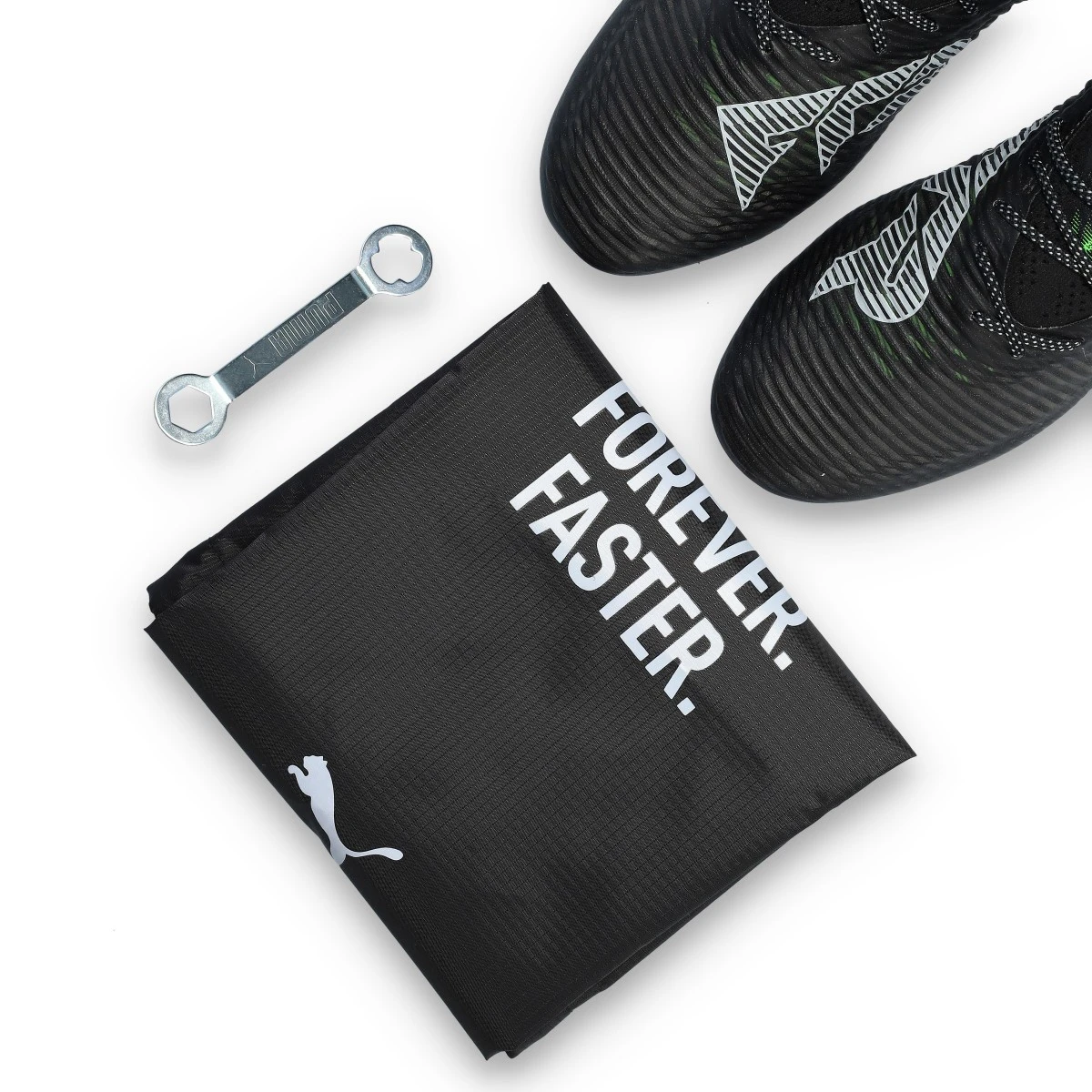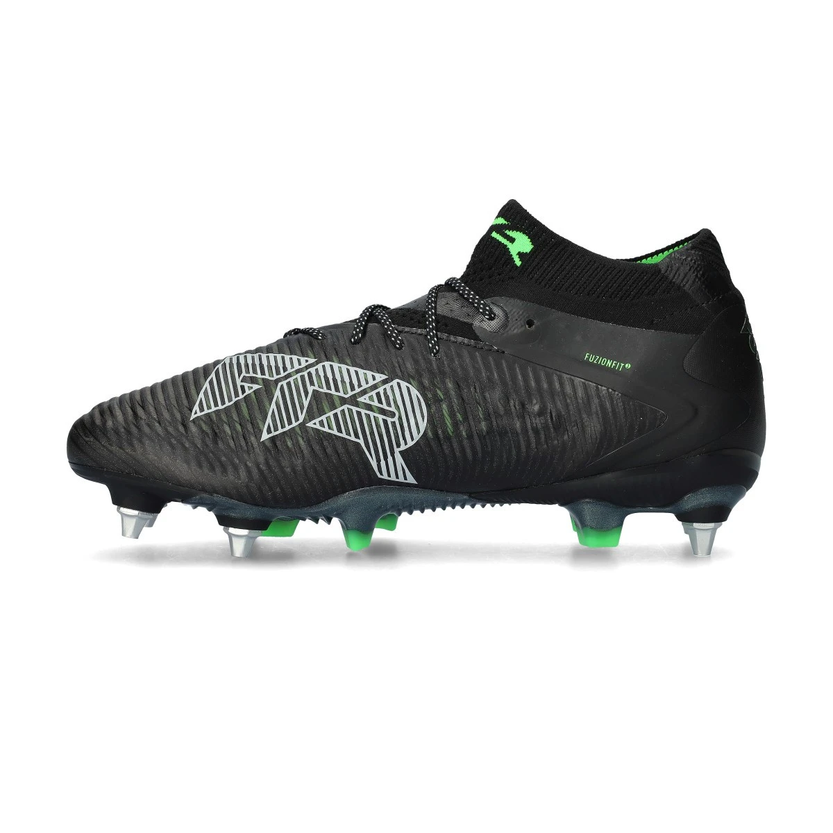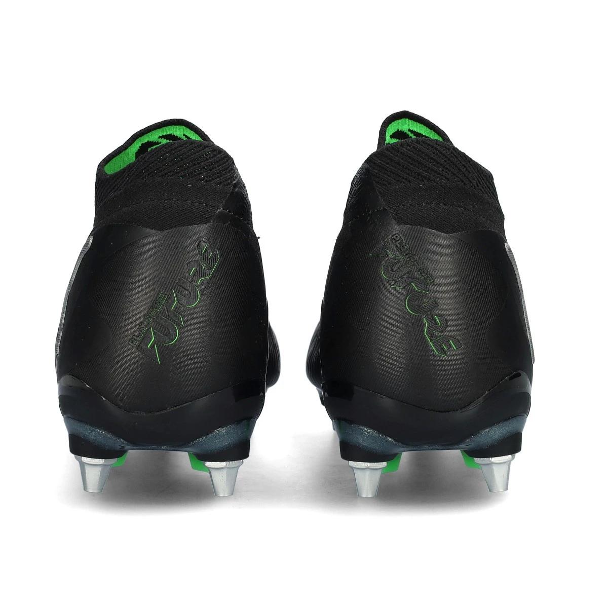 Chaussures de football Puma Future 8 Ultimate MxSG. Chaussures filetées, à utiliser sur les terrains en gazon naturel nettement humide. Chaussures haut de gamme en Black-Silver-Fluo Green.