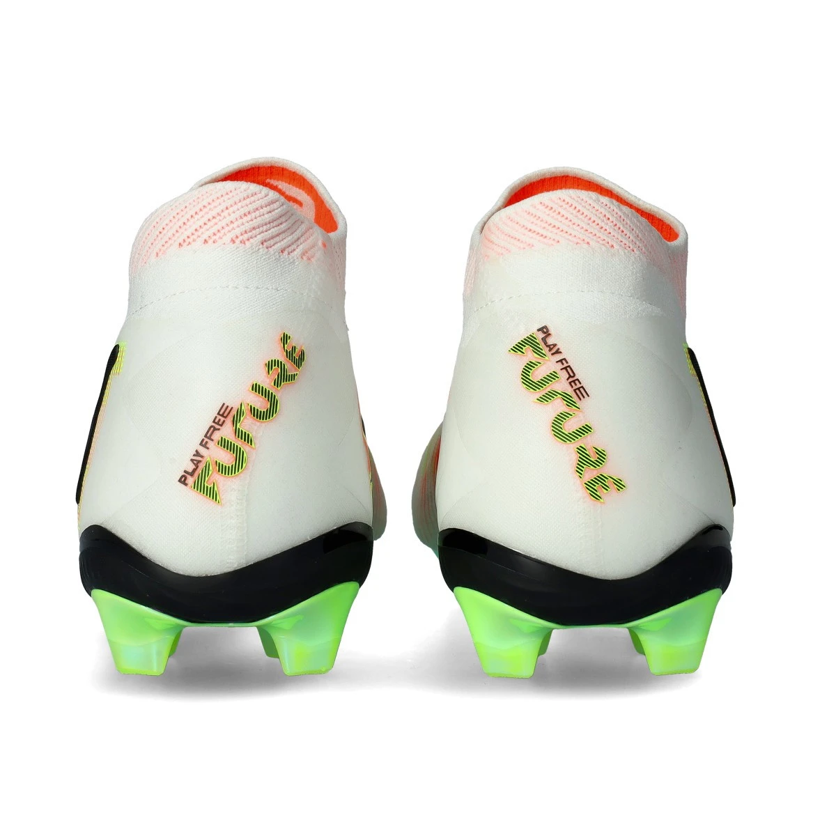 Chaussures de football Puma Future 8 Ultimate Teaser FG. Chaussures filetées, à utiliser sur les terrains en gazon naturel sec. Chaussures haut de gamme en White-Black-Lime Squeeze-Green Glare.