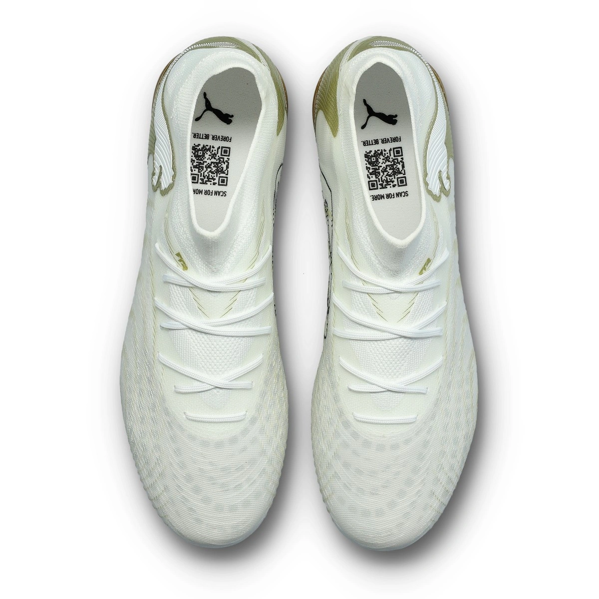 Chaussure de football Puma Future 9 Match FG/AG pour adultes. Chaussures synthétiques pour terrains en gazon artificiel et gazon naturel. Chaussures d'entrée de gamme en couleur White-Metallic Gold-Black.