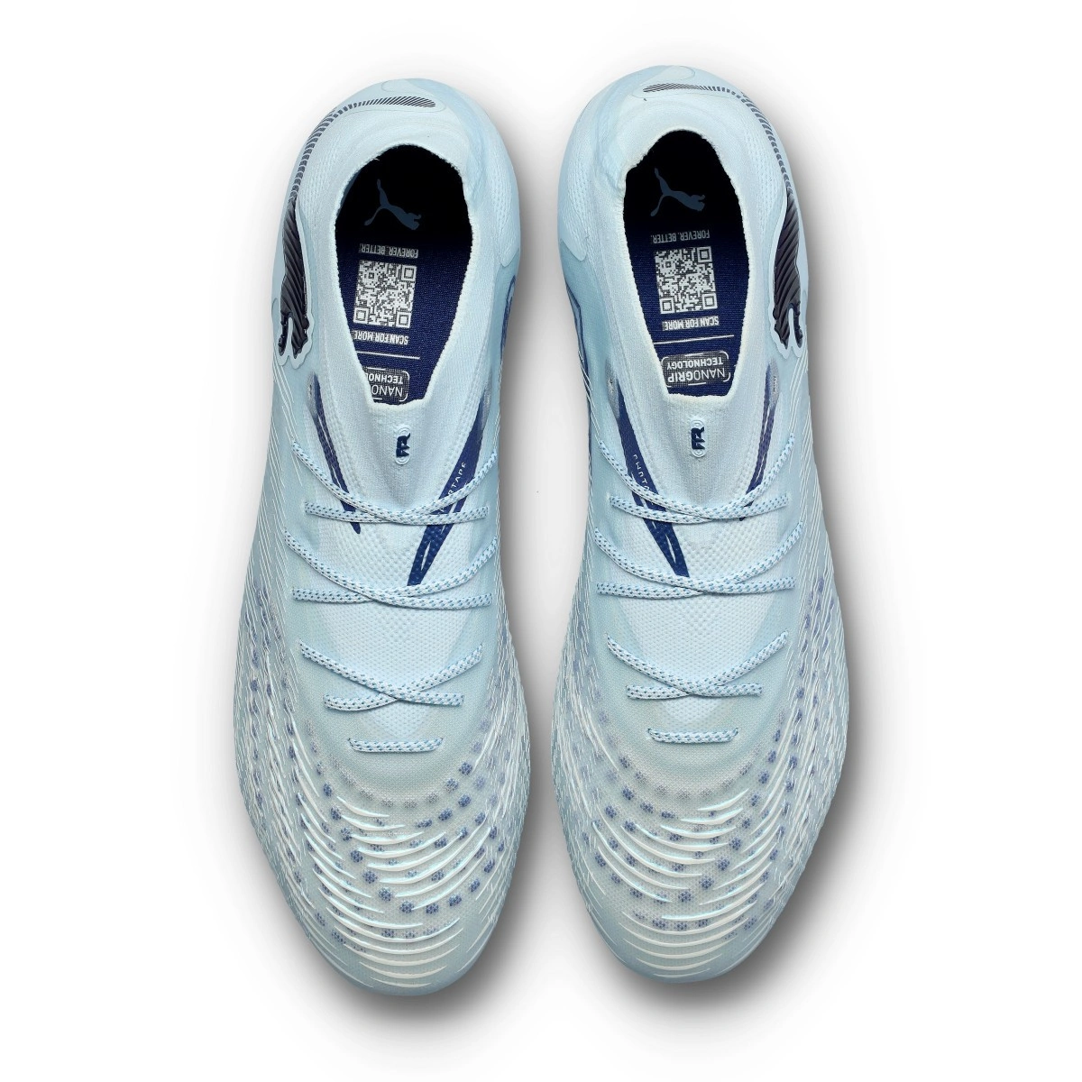 Chaussures de football Puma Future 9 Ultimate FG. Chaussures en knit pour terrains en gazon naturel sec. Chaussures haut de gamme en couleur Mint Jelly-Black-Aquatic.