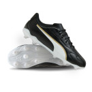 Chaussure de football Puma King 20 Play FG/AG pour enfant. Chaussures synthétiques à utiliser sur terrains en gazon naturel et artificiel. Chaussures d'entrée de gamme en couleur Puma Black-Puma White-Puma Gold.