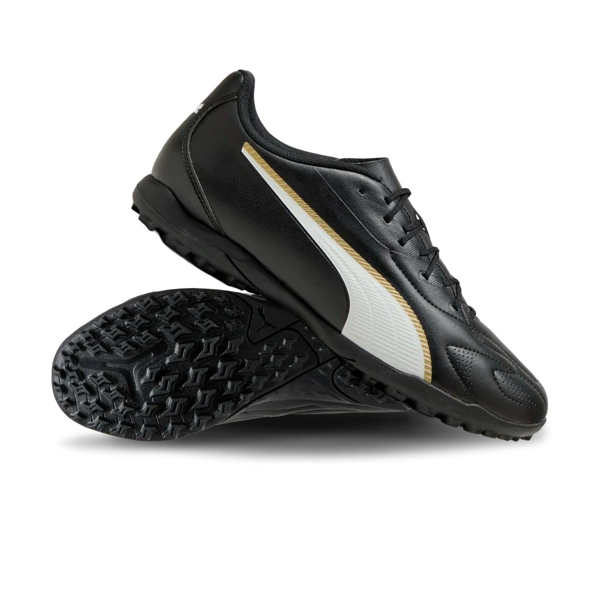 Chaussure de football Puma King 20 Play Turf. Chaussures synthétiques pour terrains en gazon artificiel et moquette. Chaussures d'entrée de gamme en couleur Puma Black-Puma White-Puma Gold.