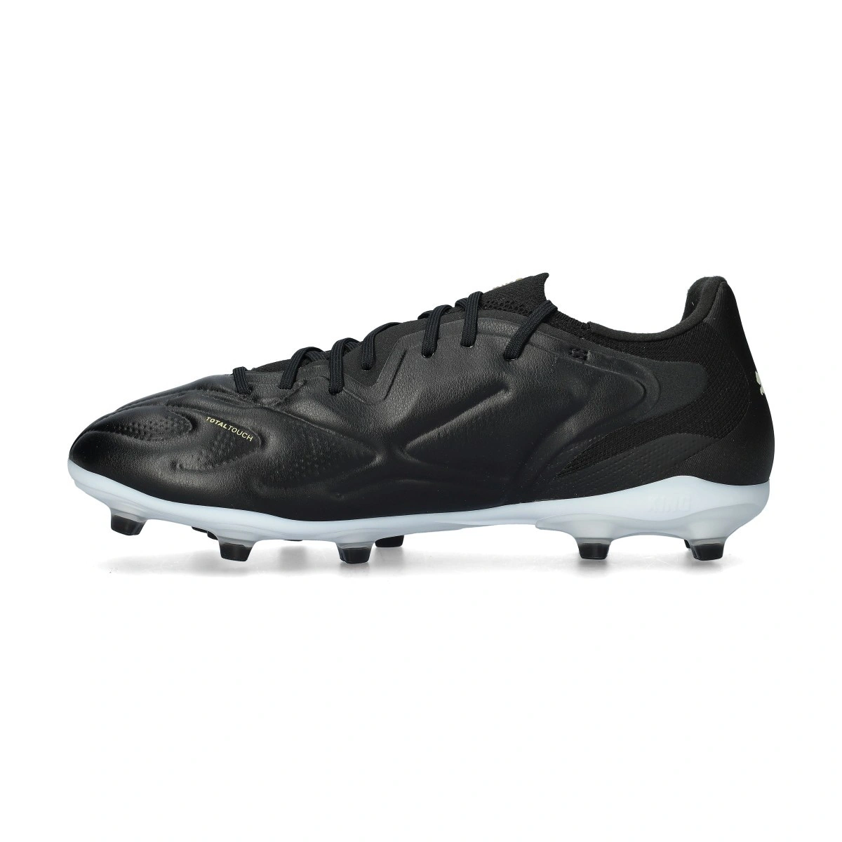 Chaussure de football Puma King Pro 20 FG/AG pour adulte. Chaussures de football en cuir synthétique pour terrains en herbe naturelle et terrains en herbe artificielle de dernière génération. Chaussures de football de gamme intermédiaire en couleur Puma Black-Puma White-Puma Gold.