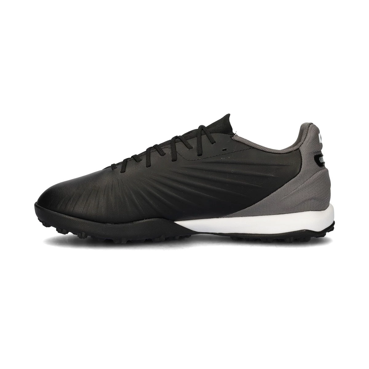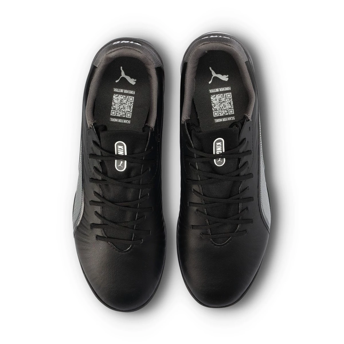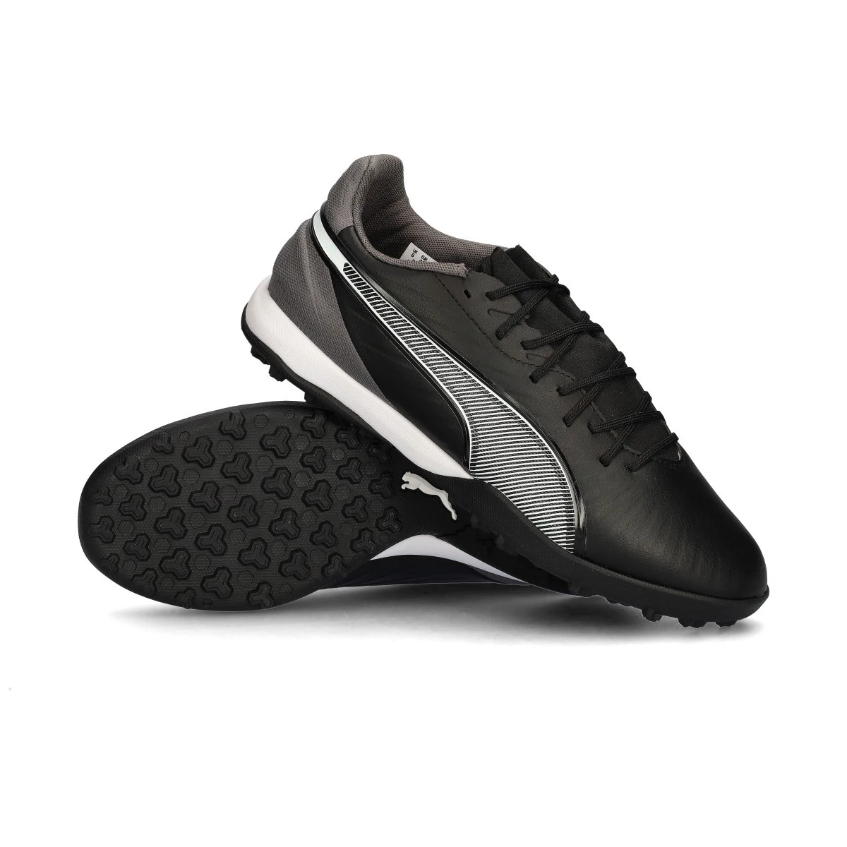 Chaussures de football Puma King Match Turf. Chaussures synthétiques à utiliser sur les terrains en gazon artificiel et en moquette. Chaussures de milieu de gamme en Black-White-Cool Dark Gray