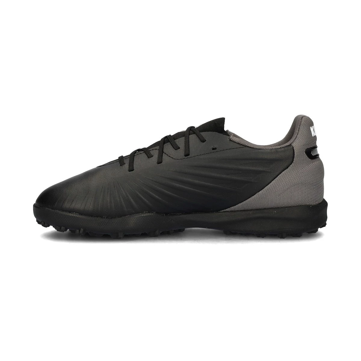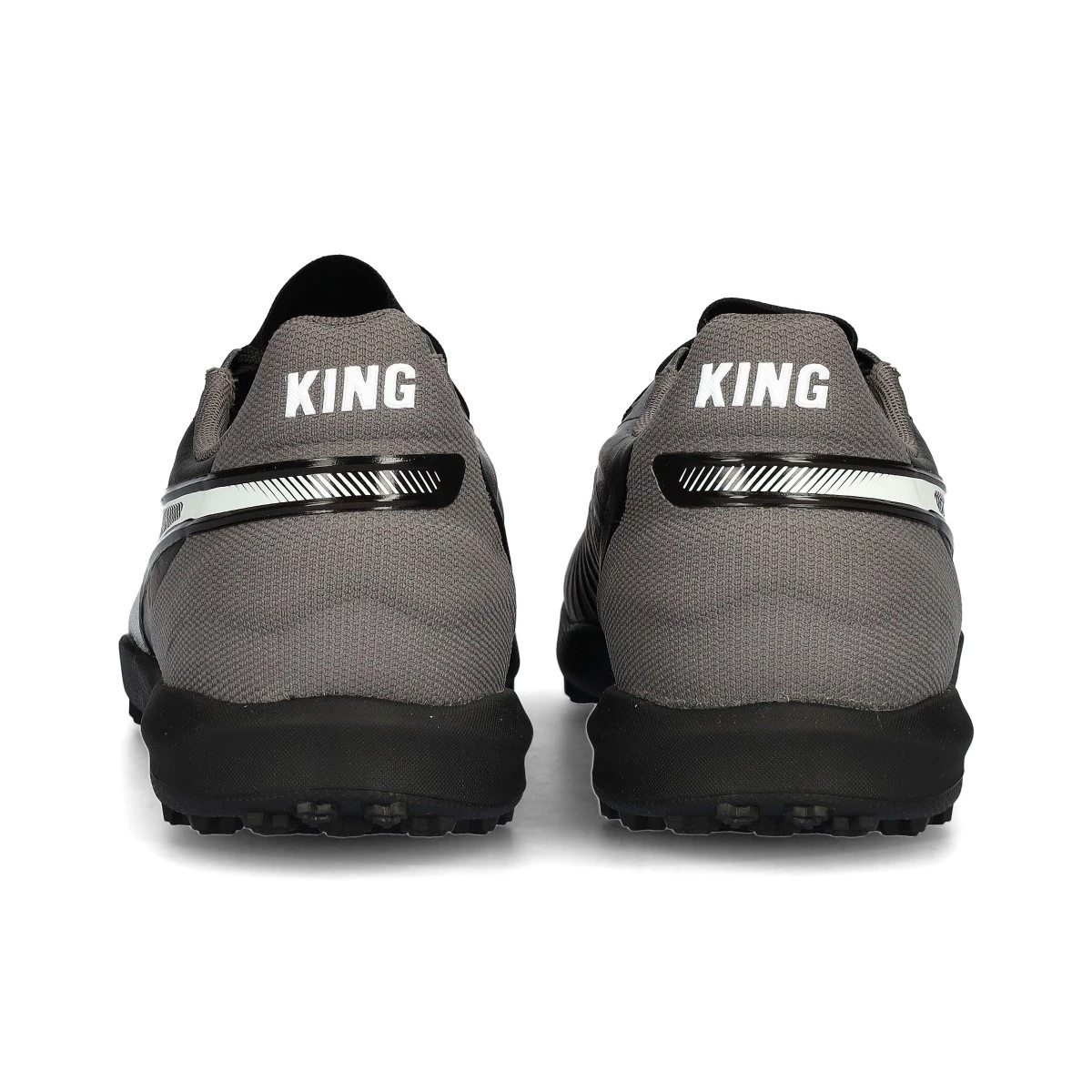 Chaussures de football Puma King Match Turf. Chaussures synthétiques à utiliser sur les terrains en gazon artificiel et en moquette. Chaussures de milieu de gamme en Black-White-Cool Dark Gray.