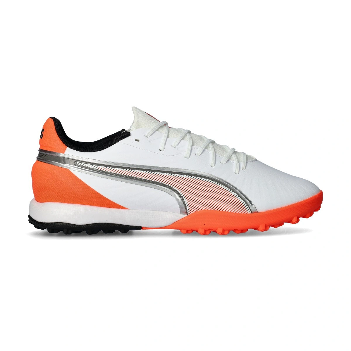 Chaussure de football Puma King Match Turf pour adultes Chaussure synthétique adaptée aux terrains en gazon artificiel et moquette. Modèle de gamme moyenne en coloris White-Silver-Glowing Red.