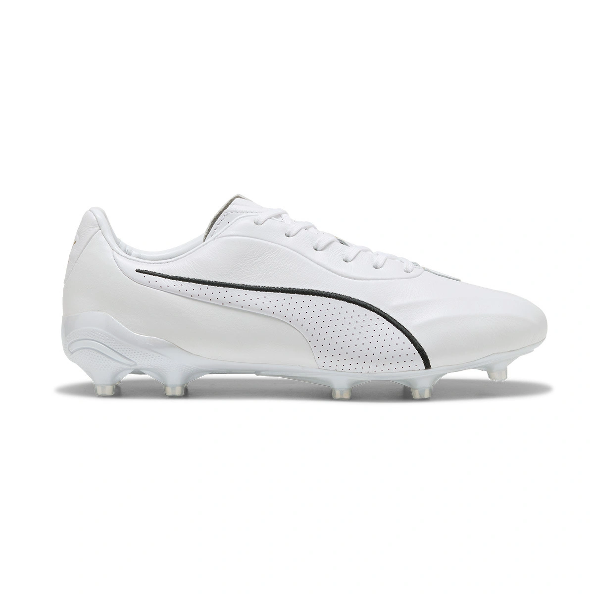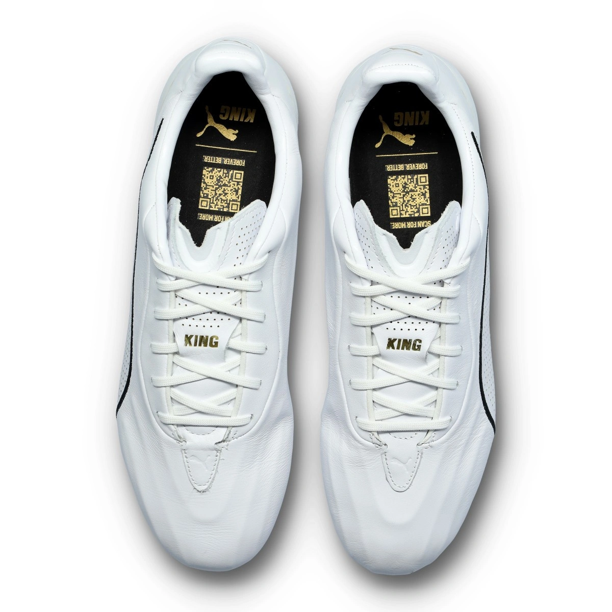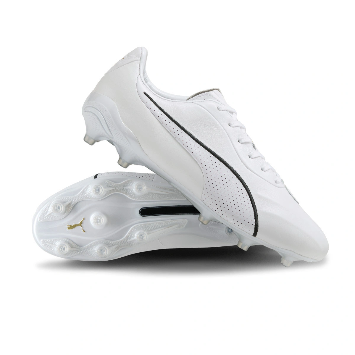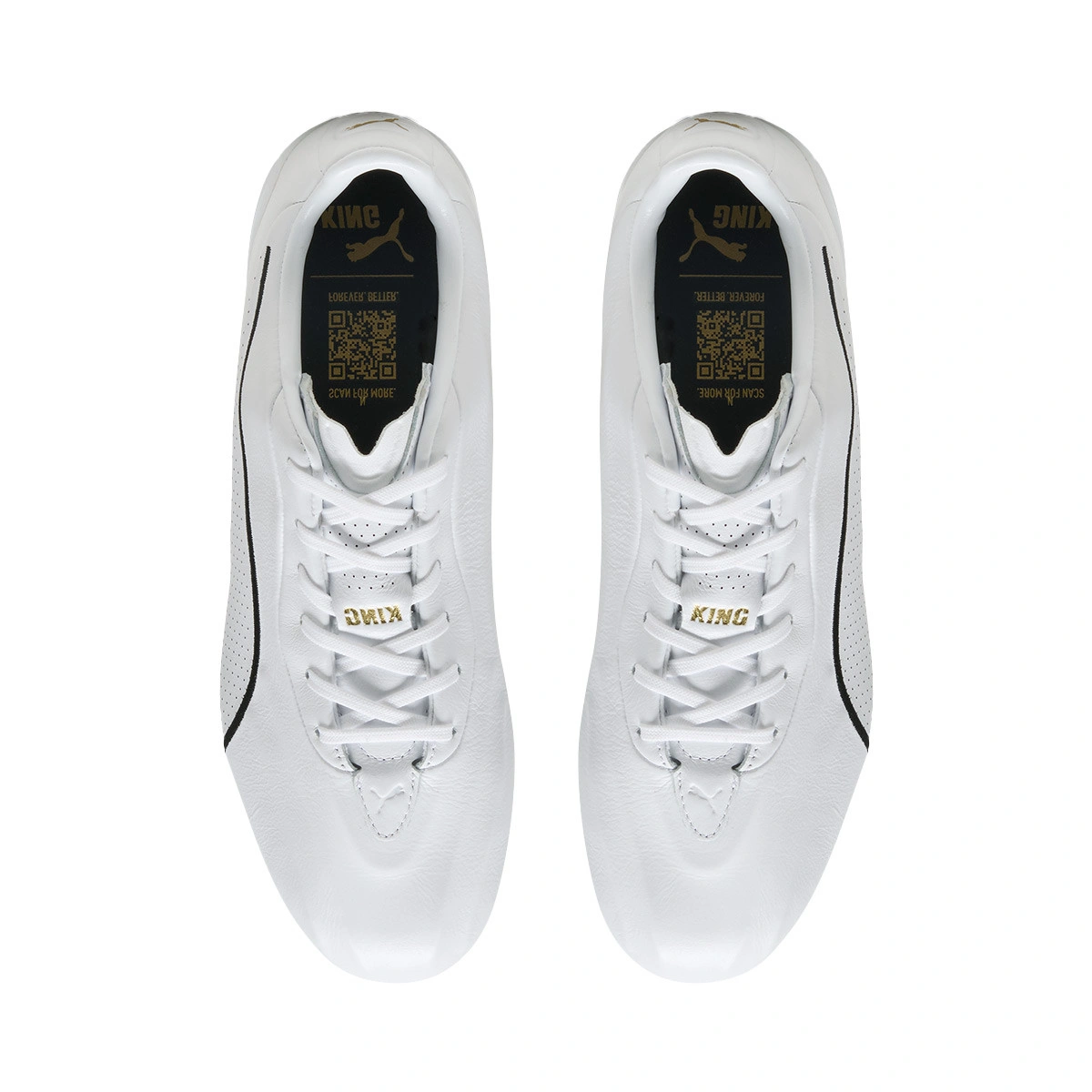 Chaussure de football Puma King Platinum FG/AG. Chaussure haut de gamme avec lacets pour terrains en gazon naturel et artificiel en coloris White-Metallic Gold-Black.