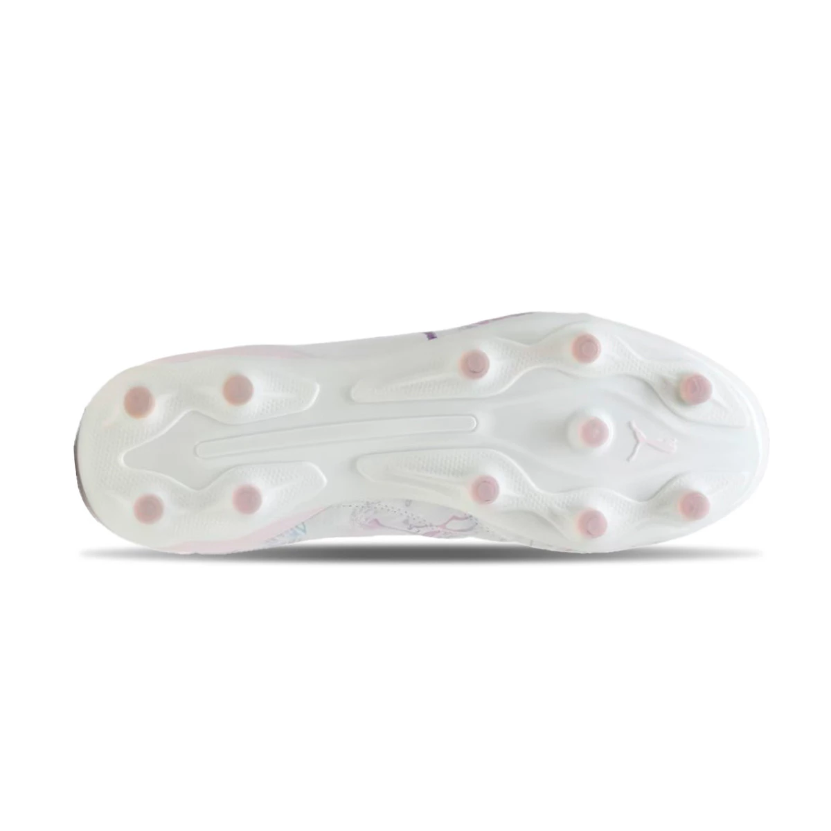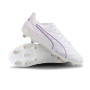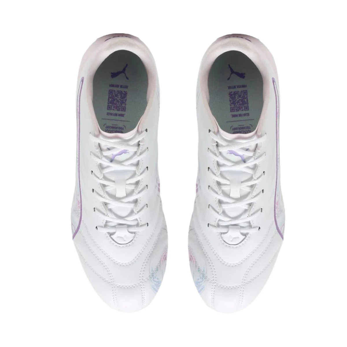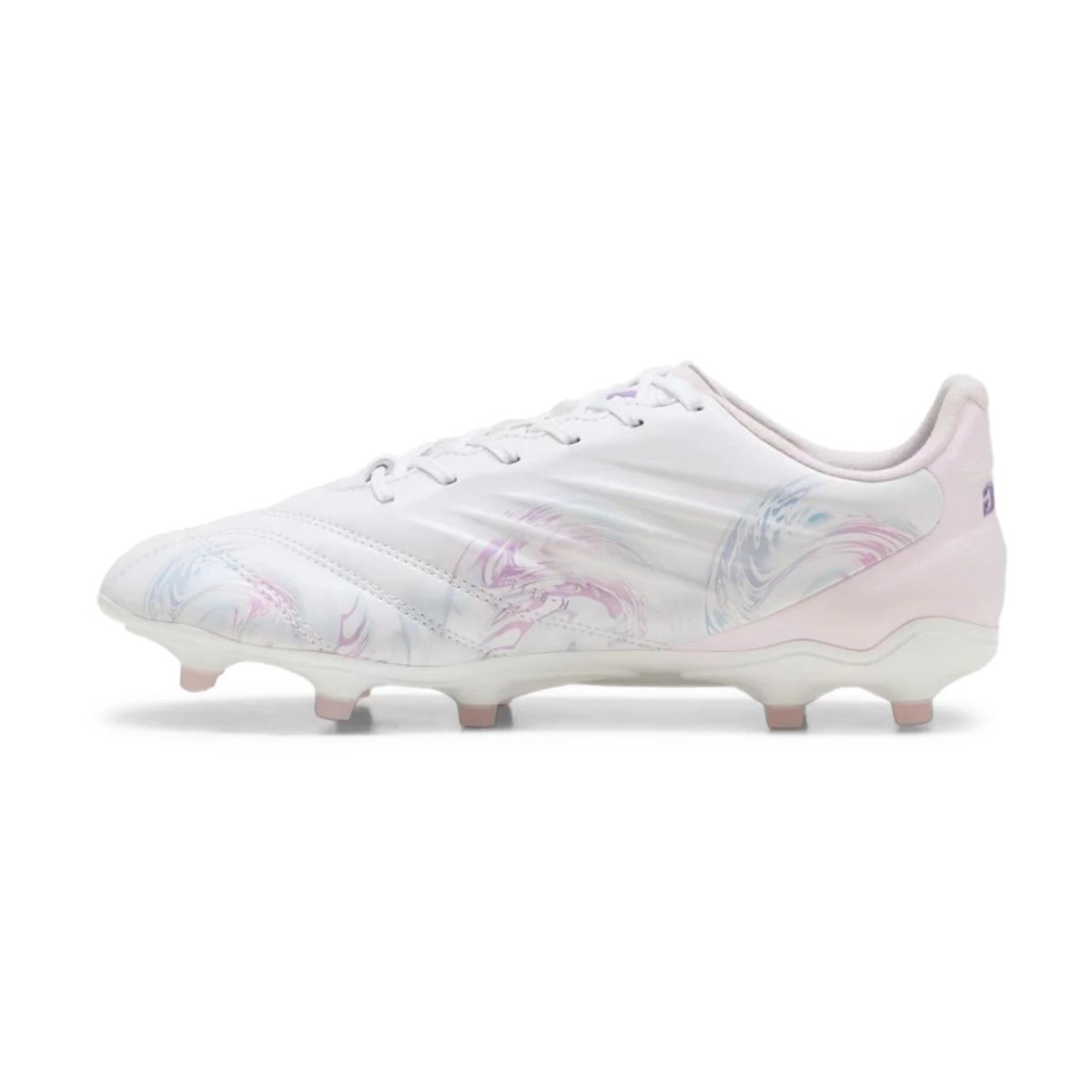 Chaussures de football Puma King Pro FG/AG. Chaussures de football en cuir synthétique pour les terrains en gazon naturel et les terrains en gazon artificiel de dernière génération. Chaussures de football de milieu de gamme en White-Black-Spring Lavender.
