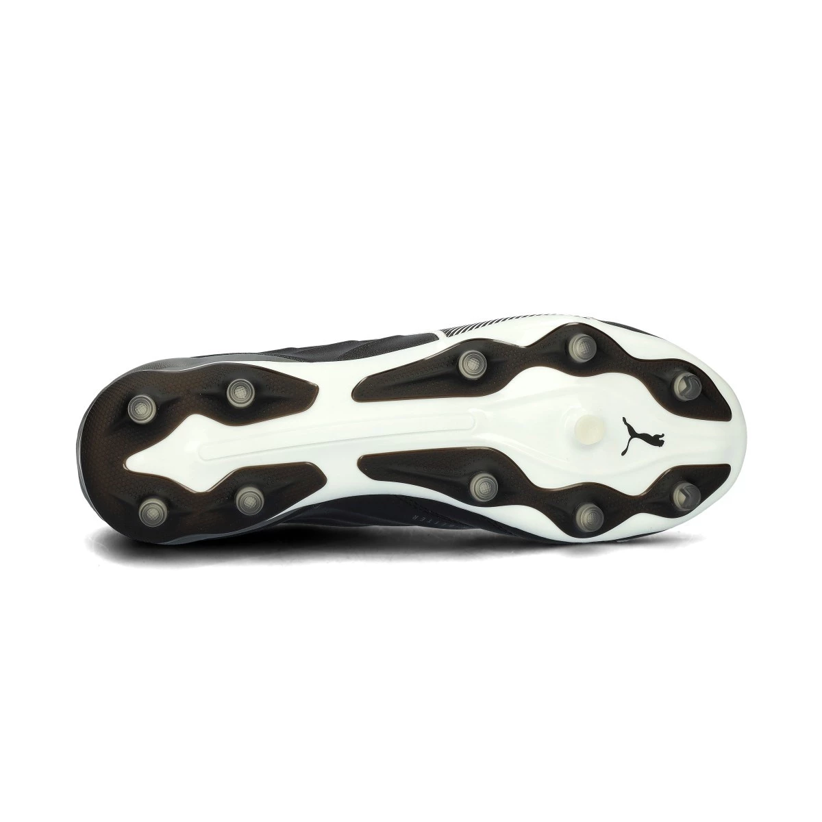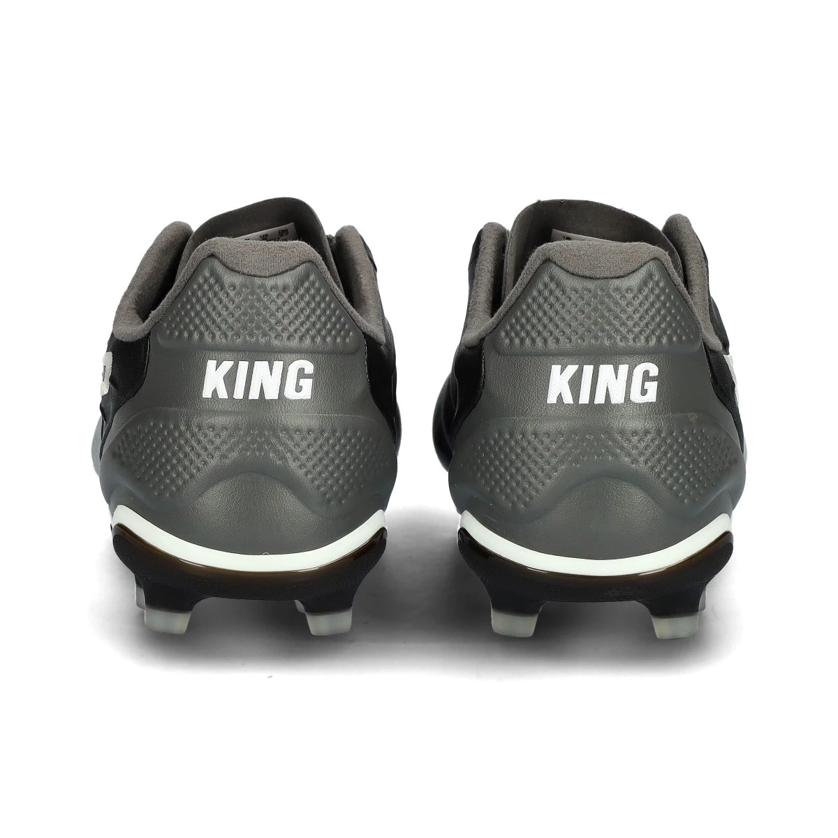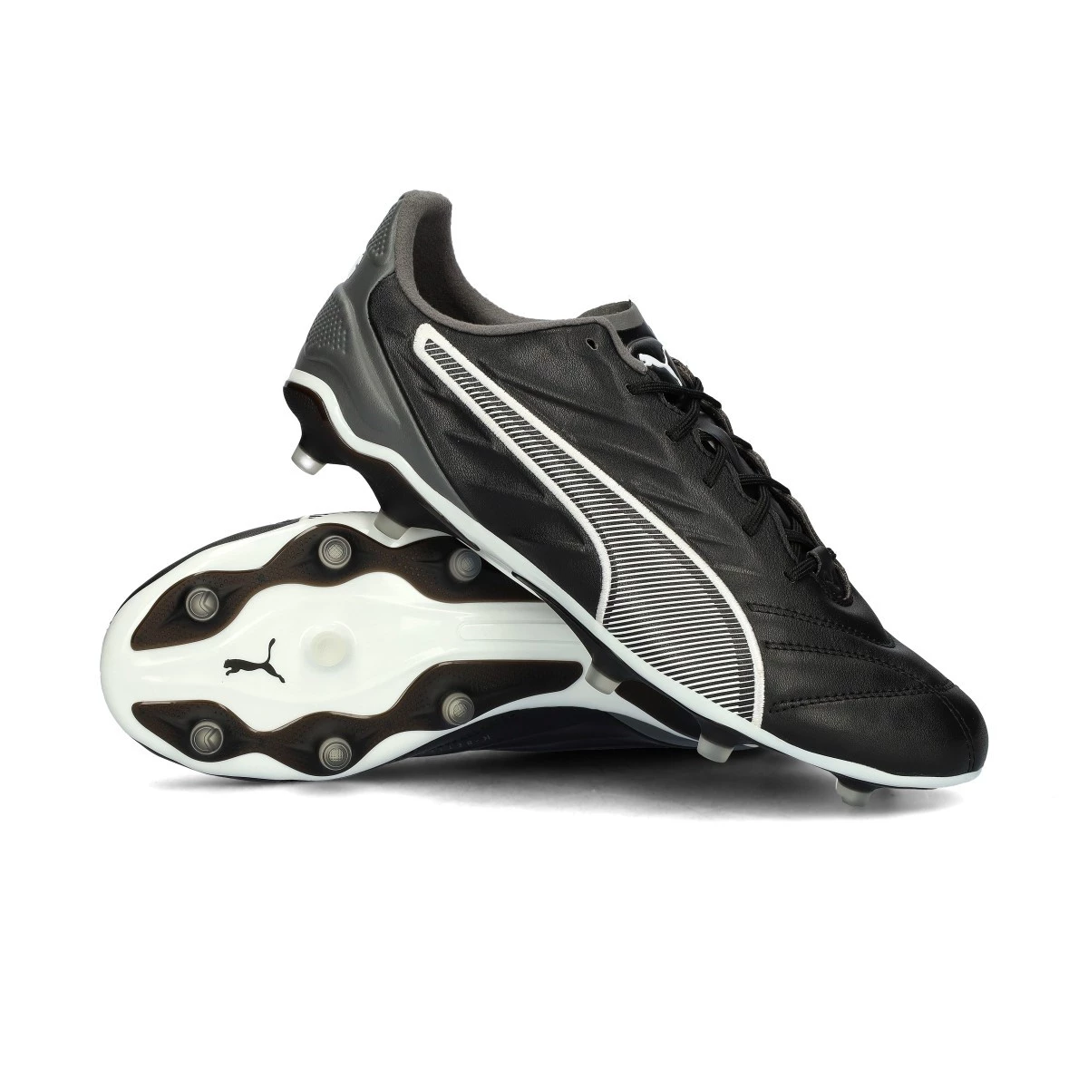 Chaussures de football Puma King Pro FG/AG. Chaussures de football en cuir synthétique pour les terrains en gazon naturel et les terrains en gazon artificiel de pointe. Chaussures de football de milieu de gamme en Black-White-Cool Dark Gray.