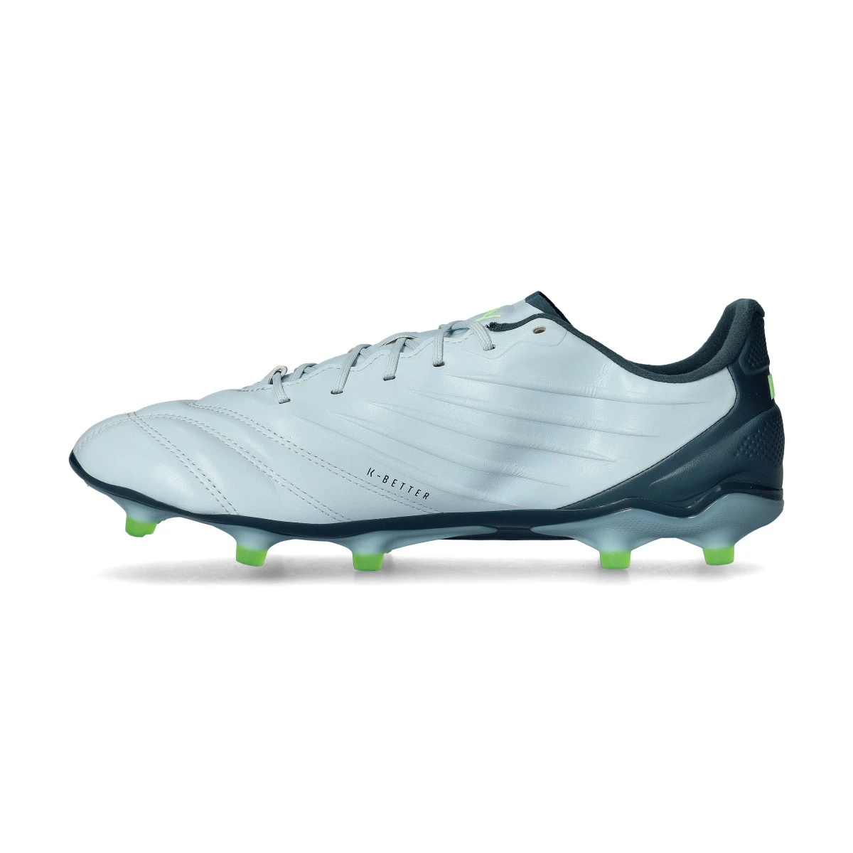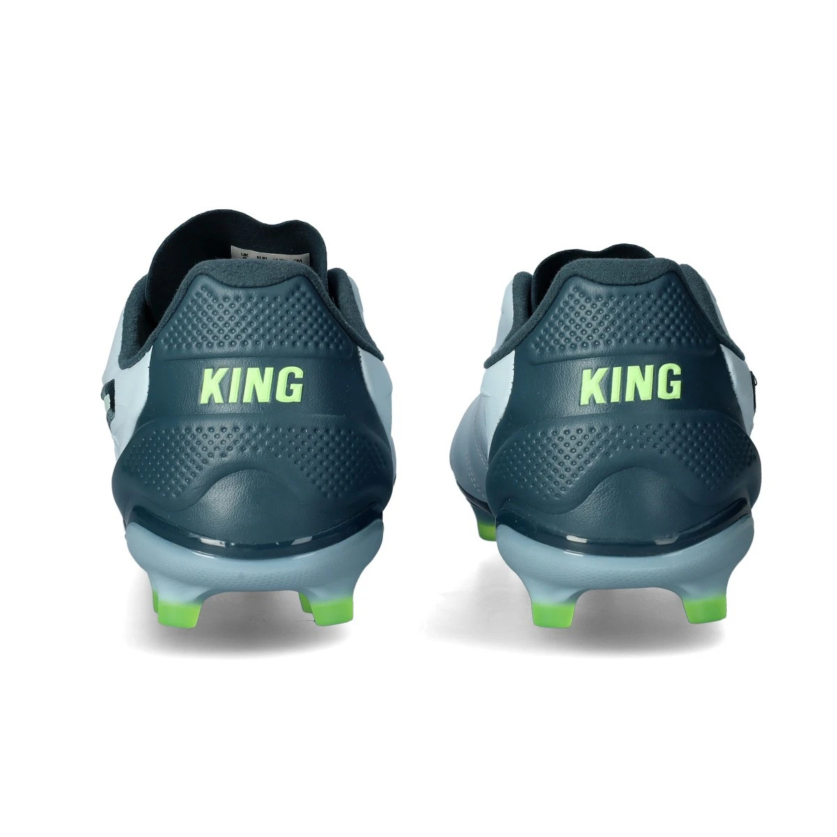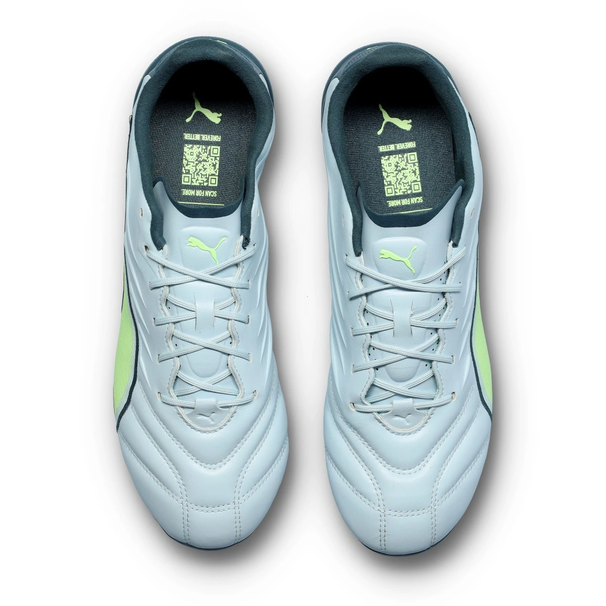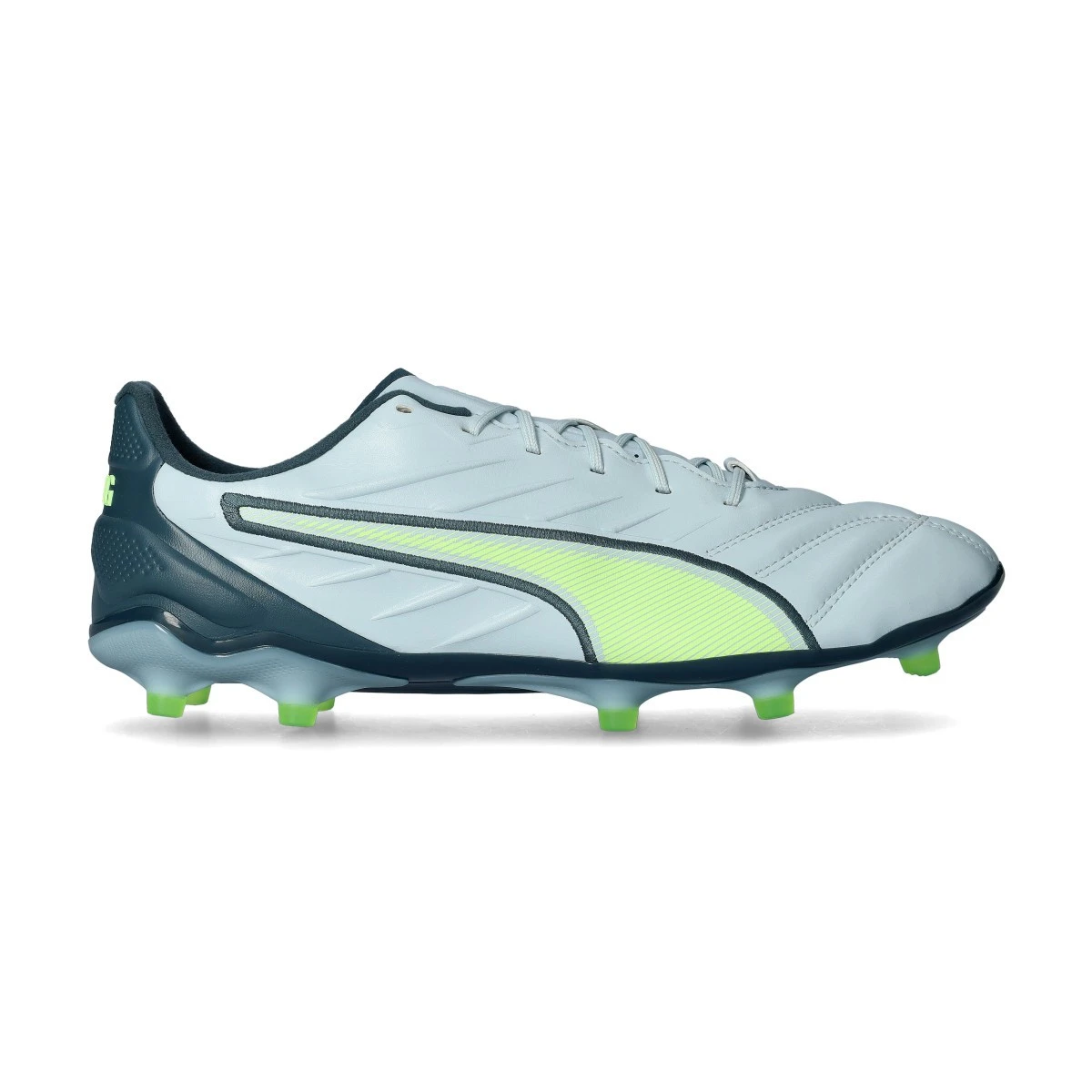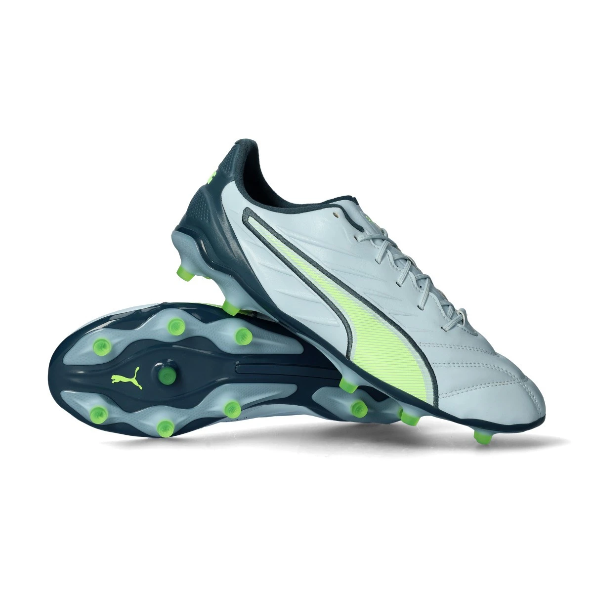 Chaussures de football Puma King Pro FG/AG pour femme. Chaussures de football en cuir synthétique pour les terrains en gazon naturel et les terrains en gazon artificiel de dernière génération. Chaussures de football de milieu de gamme dans le coloris Frosted Dew-Fizzy Apple-Gray Skies.