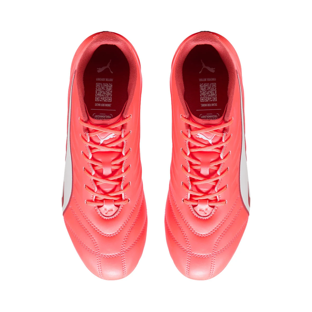Chaussures de football Puma King Pro FG/AG pour femmes. Modèles en cuir synthétique pour les terrains en gazon naturel et les terrains en gazon artificiel de pointe. Chaussures de football de milieu de gamme de couleur Glowing Red-White-Red Fire.