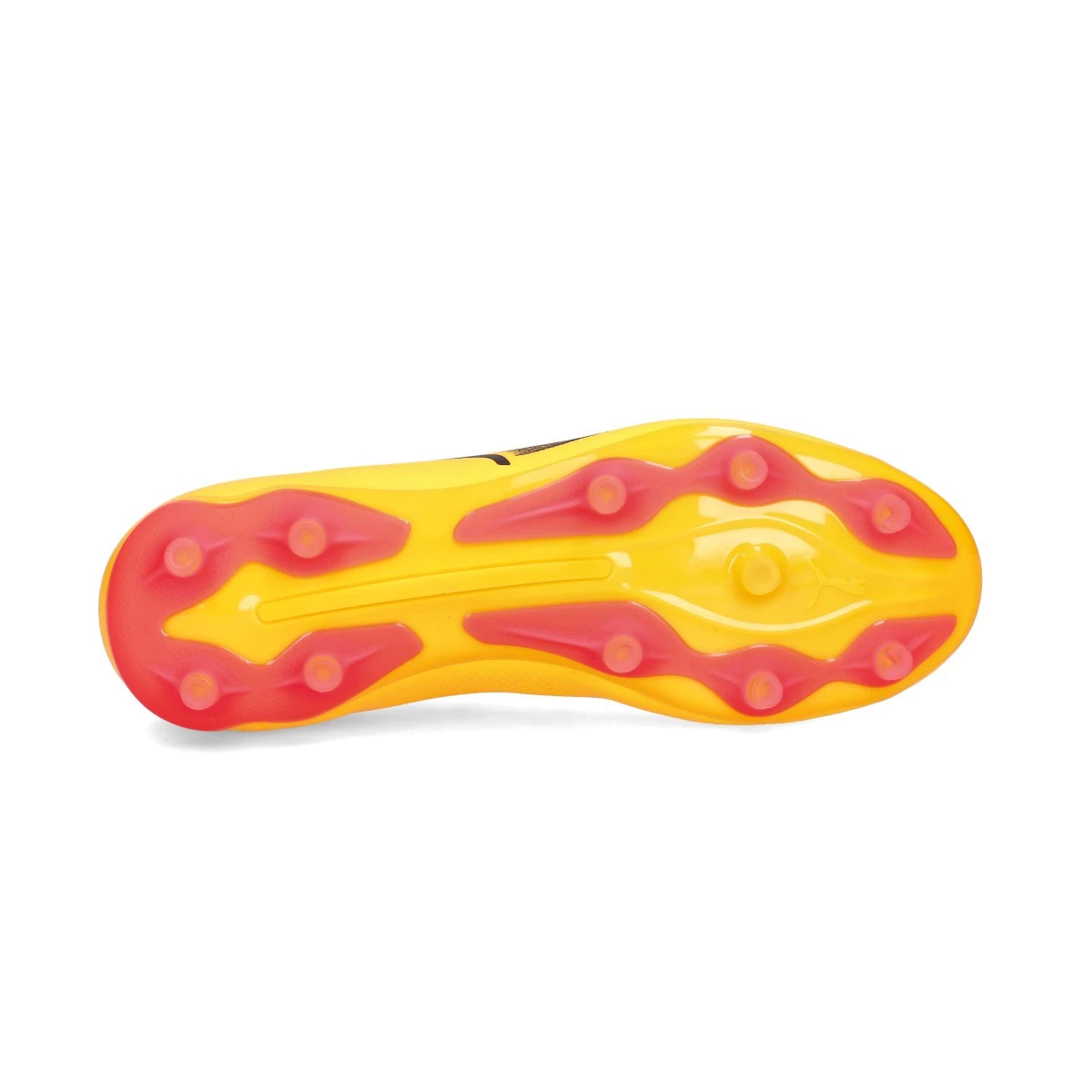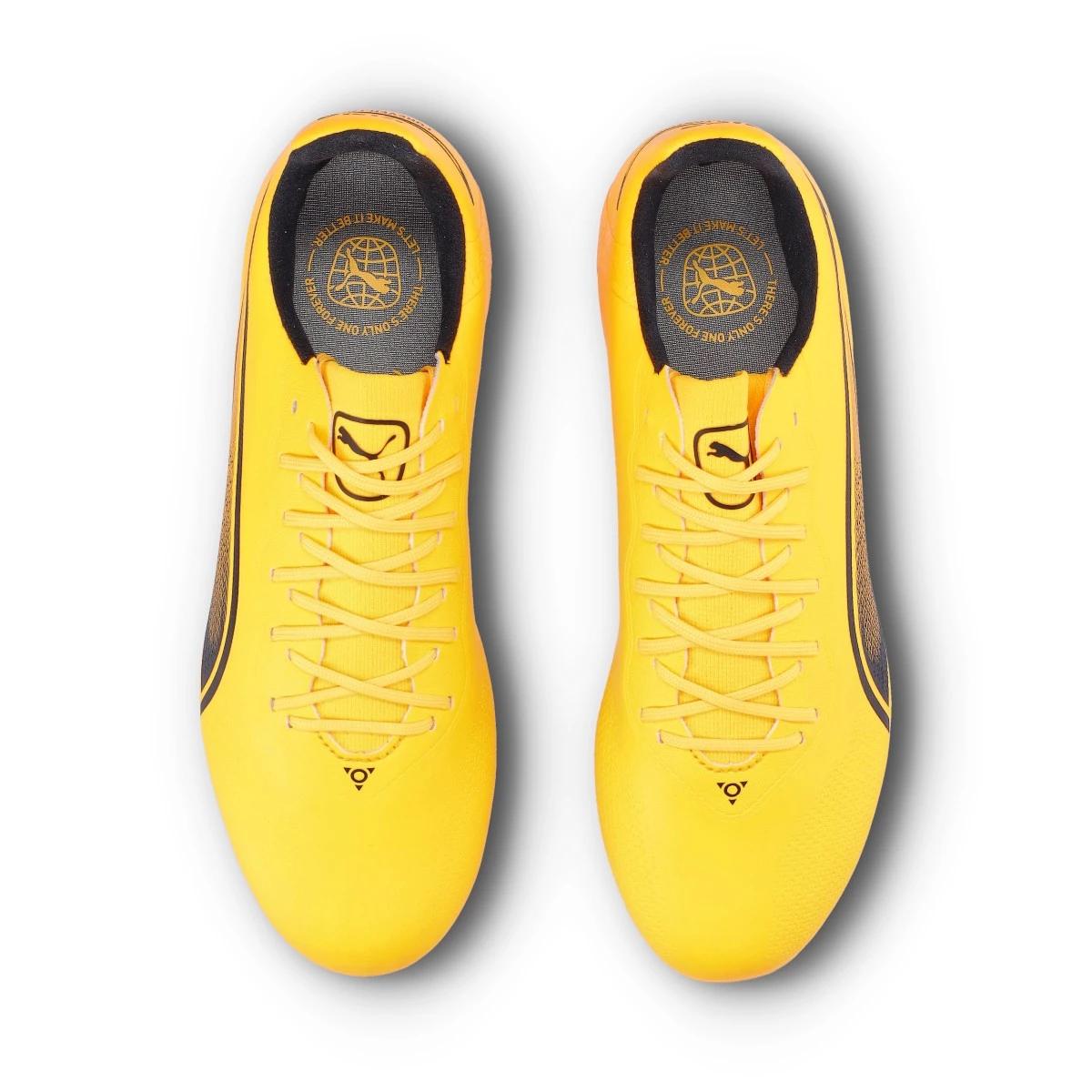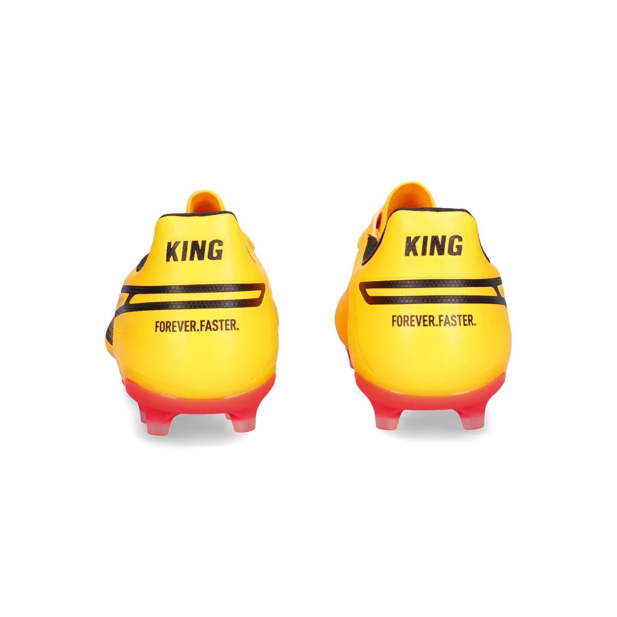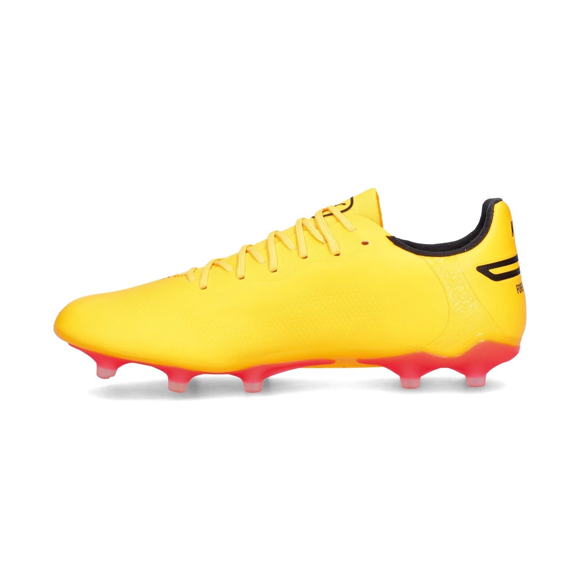 Chaussures de football Puma King Pro FG/AG. Chaussures de football en cuir synthétique pour les terrains en gazon naturel et les terrains en gazon artificiel de pointe. Chaussures de football de milieu de gamme en couleur Sun Stream-Black-Sunset Glow.