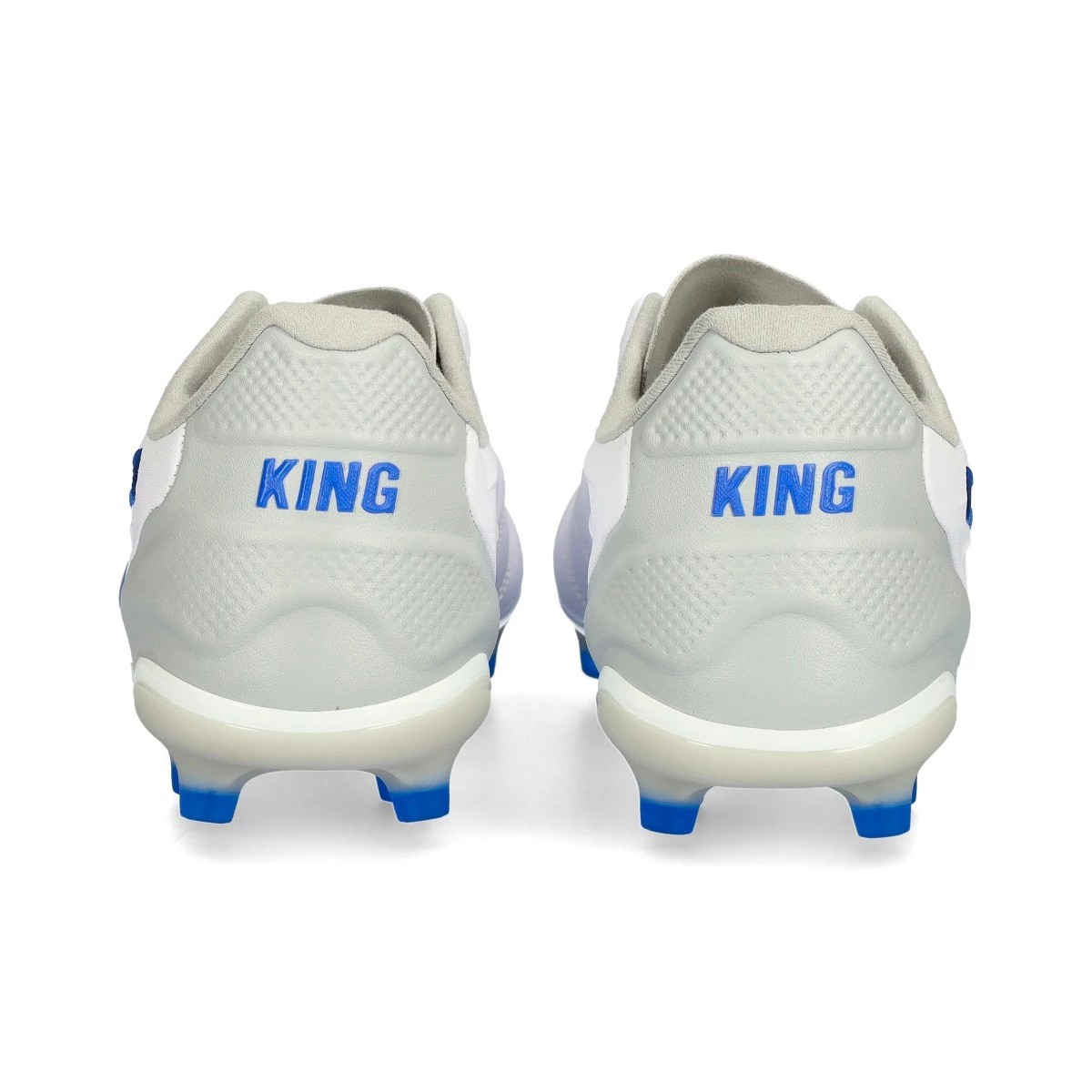 Chaussures de football Puma King Pro FG/AG. Chaussures de football en cuir synthétique pour les terrains en gazon naturel et les terrains en gazon artificiel de dernière génération. Chaussures de football de milieu de gamme en White-Bluemazing-Flat Light Gray.