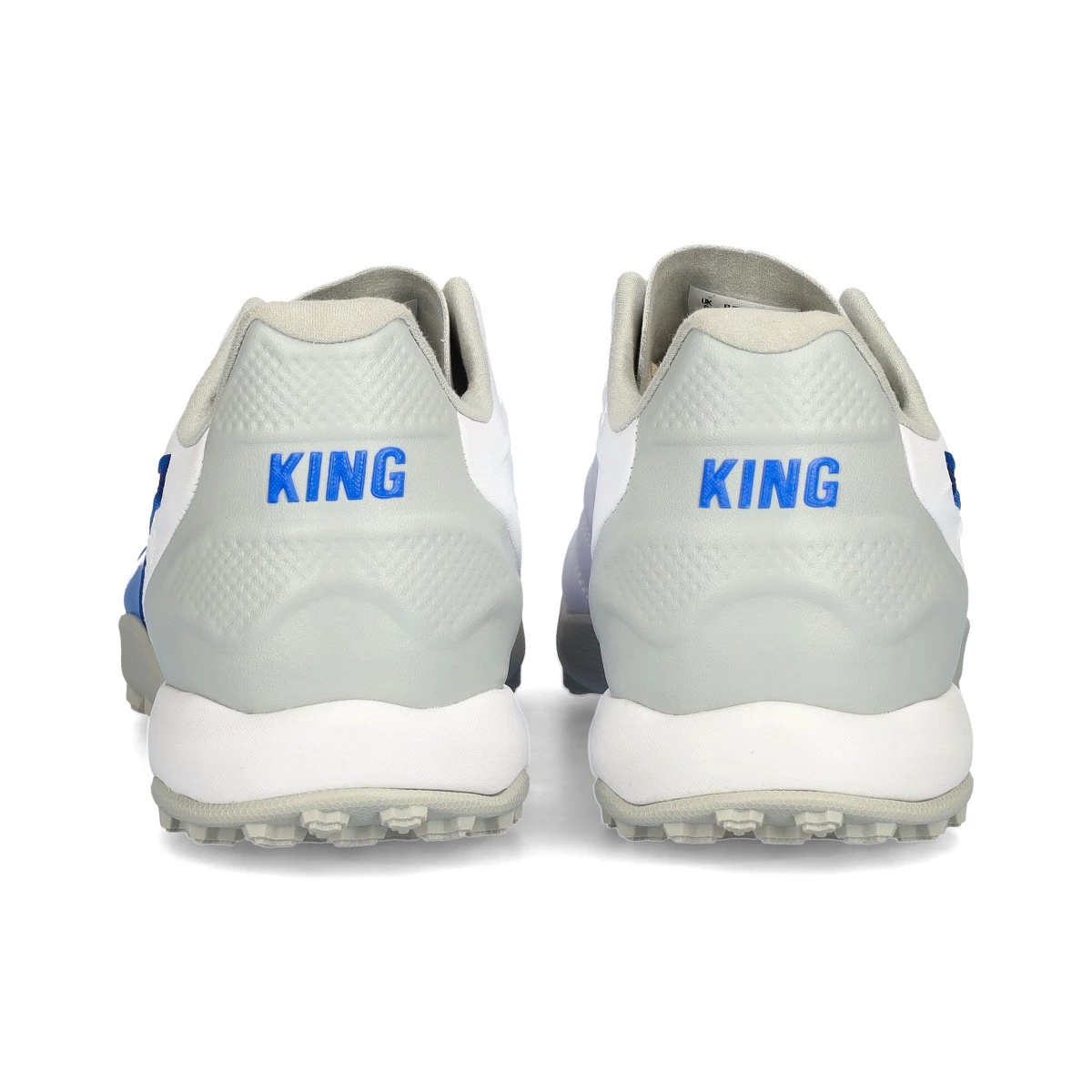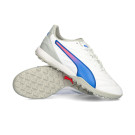 Chaussures de football Puma King Pro Turf. Chaussures synthétiques à utiliser sur les terrains en gazon artificiel et en moquette. Chaussures de milieu de gamme en White-Bluemazing-Flat Light Gray.