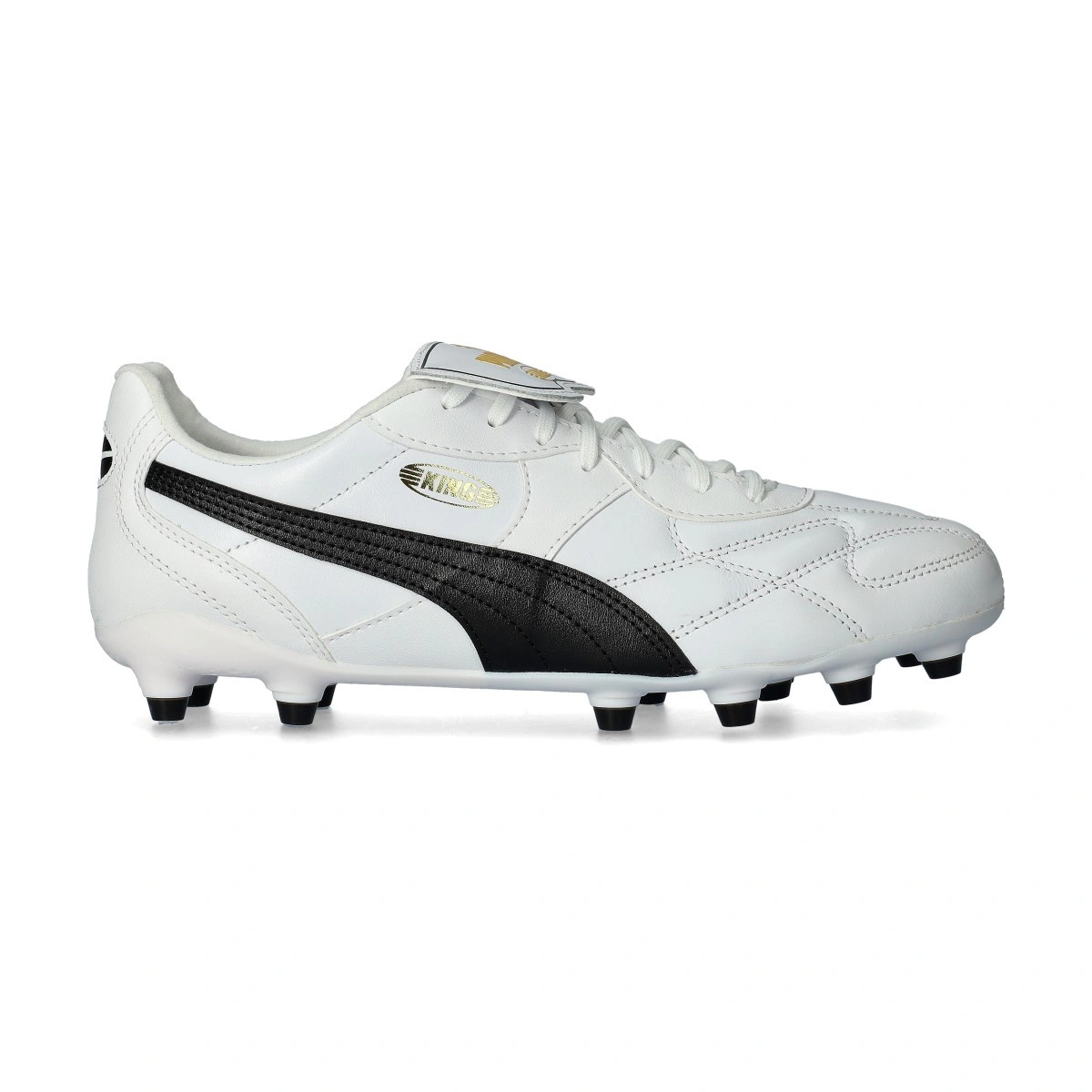 Chaussure de football Puma King Top FG/AG. Chaussure de gamme intermédiaire avec lacets pour terrains en gazon naturel et artificiel en coloris White-Black.