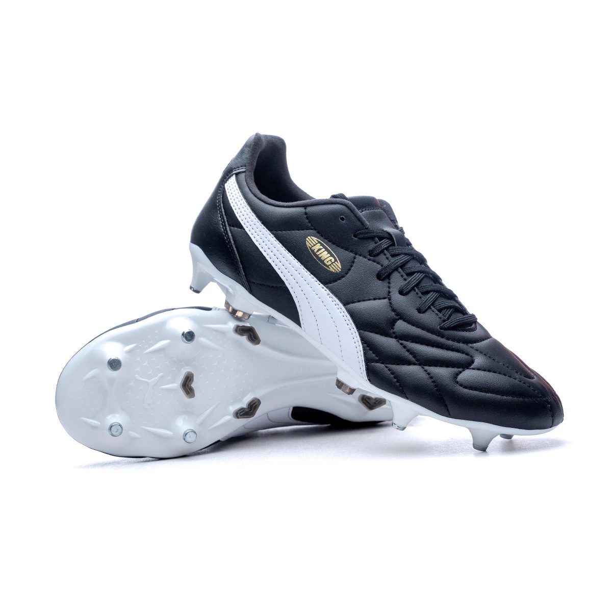 Chaussures de football King Top MxSG en Black-White-Gold. Chaussures synthétiques pour jouer sur des terrains en gazon naturel humide.