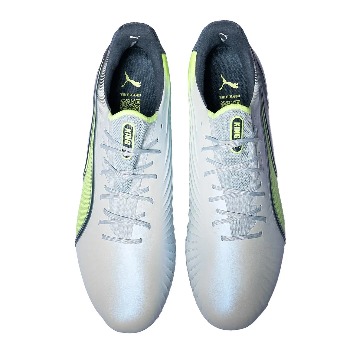 Chaussures Puma King Ultimate FG/AG en couleur Frosted Dew-Fizzy Apple-Gray Skies. Chaussures conçues pour jouer sur des terrains en gazon naturel et artificiel.